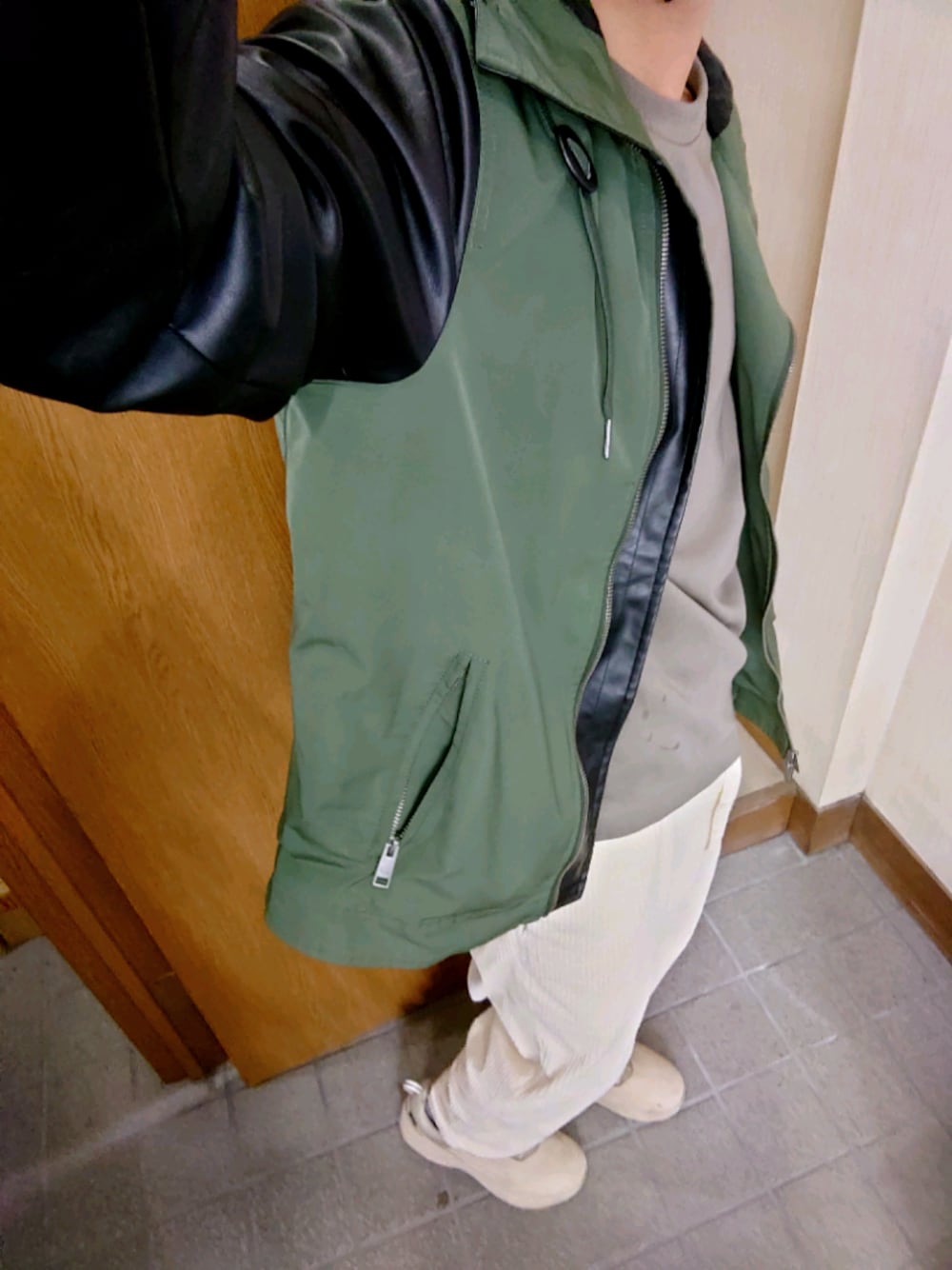黒閃!! 白×緑×カーキ けっこうすき アウター:マウンテンパーカー ARMANI exchange カットソー:UNITEDTOKYO カーキ パンツ:GU コーデュロイ 白