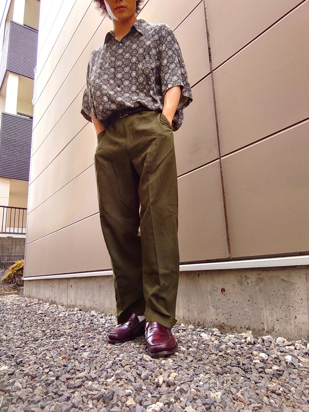 カーキ色にブラウンのローファーの渋さね