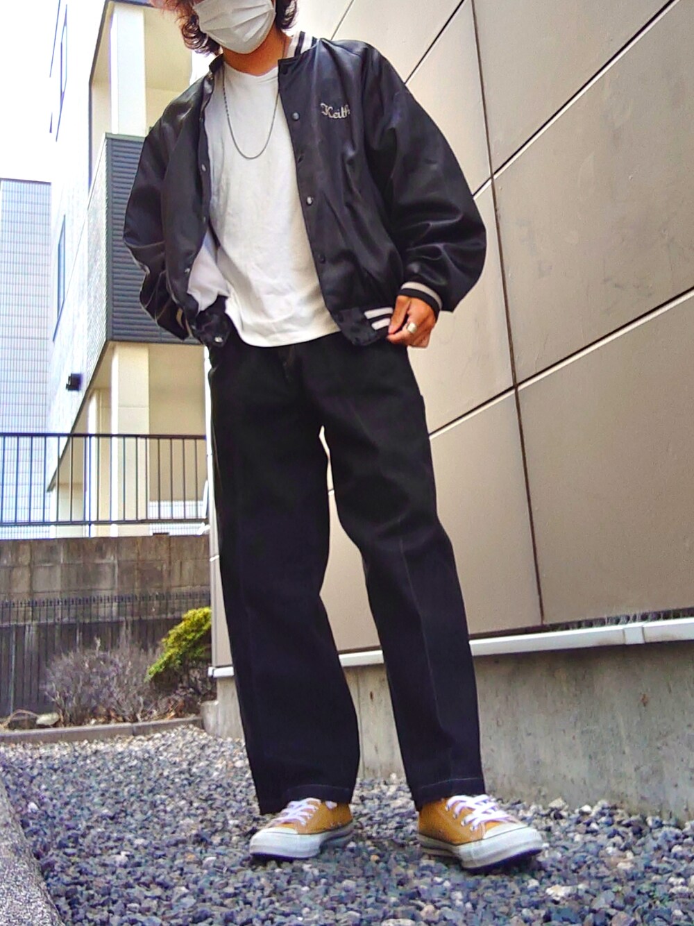プレスの効いたデニムがかっこいい、、 モノトーンだけど足元の黄色がかわいい