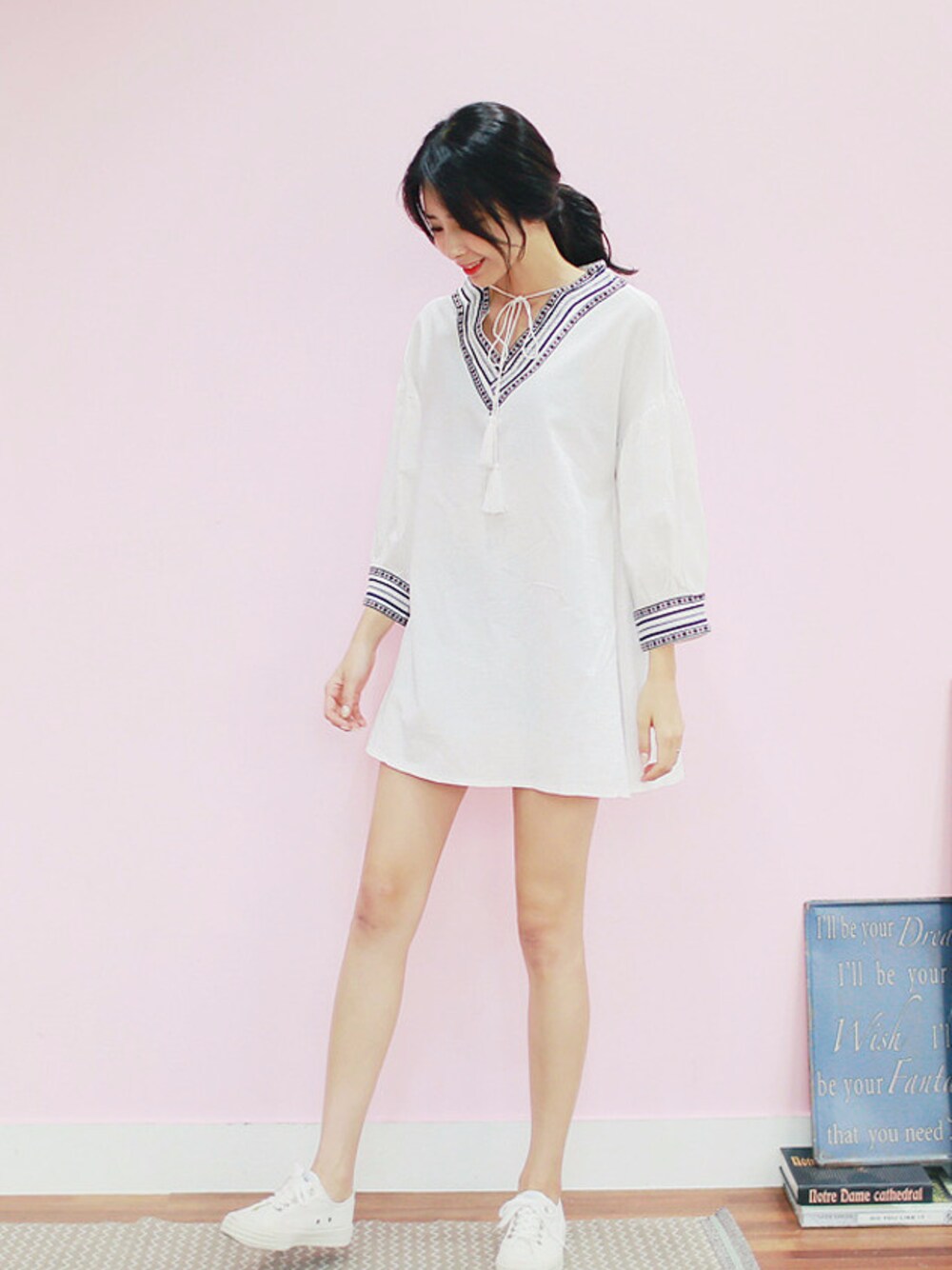 エスニックな刺繍デザインが乙女チックなワンピース。 ネックラインのタッセルと 個性的な絶妙なミニ丈がスタイルに差を付けます。 エスニック調なので、ユニークな魅力あり。 ふんわりした袖のデザインがキュートなアクセントになっています! 一枚で十分存在感があるから、 コーディネートを考えずに着こなしを楽しめるワンピースです。