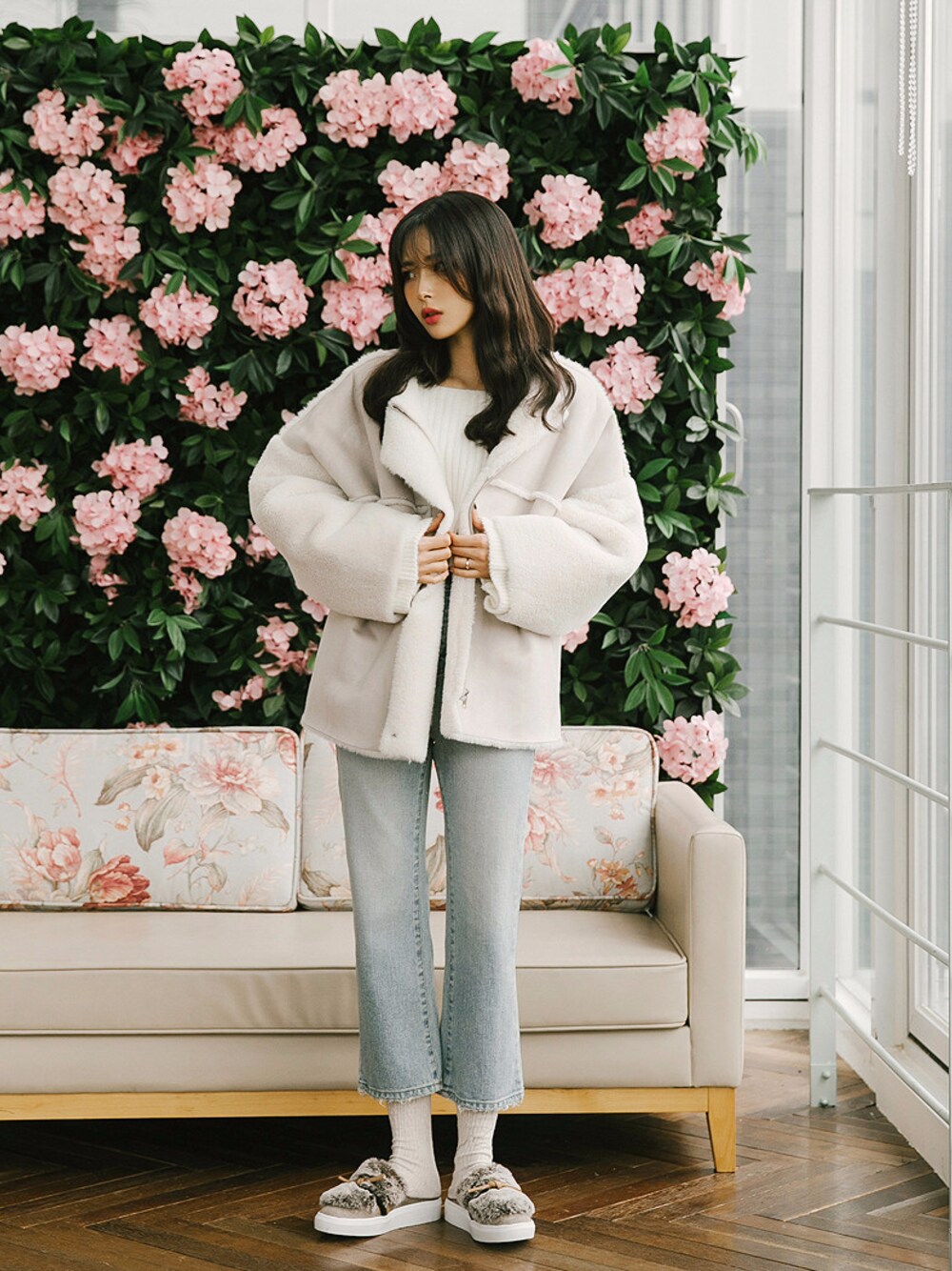 2perのムートンコート「ノーカラージ ップアップ切り替えムートンジャケット(P0000EQP)」を使ったコーディネート