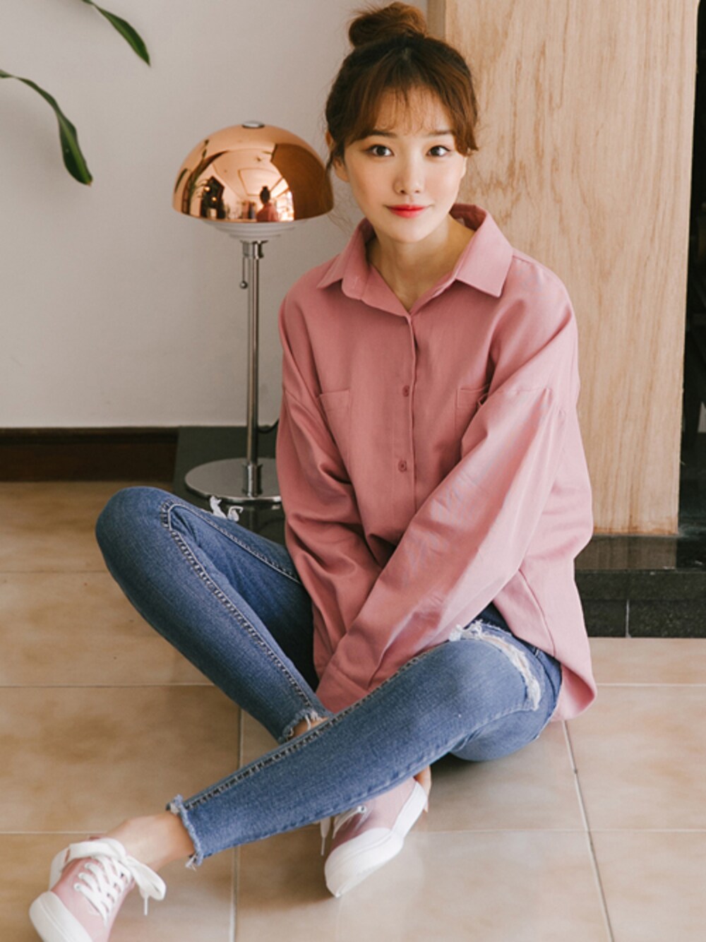 韓国で流行するフラワー・パターンブラウスと中央部分のポイントを生かしたピンクスカートの調和!女感じのコーディに韓国の芸能人たちが好むファッションです