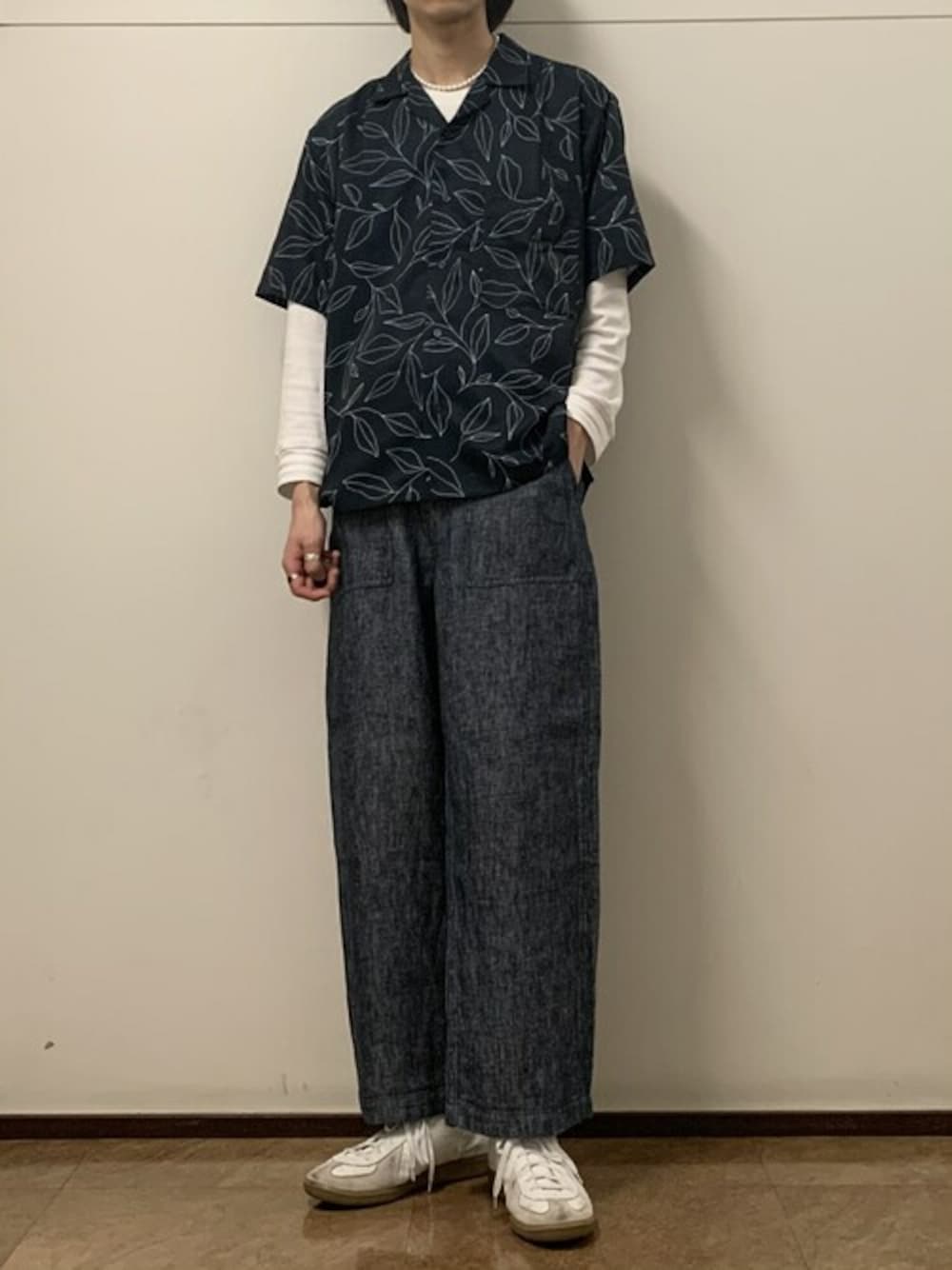 【重ね着コーデ】 夏を彷彿させるような柄シャツ。 そこまで激しい柄じゃないので、着回しが効くと思います! -size- シャツ(Lサイズ)…ややゆったり・テロテロとした素材感で風になびいた時のシルエットも美しいです・派手すぎずちょうどいい柄なので使い回しが利くと思います デニム(Mサイズ)…ストレートデニ厶でややレングスが長めの印象・麻を使っているのでとても軽くて涼しいです 着用177cm/痩せ型