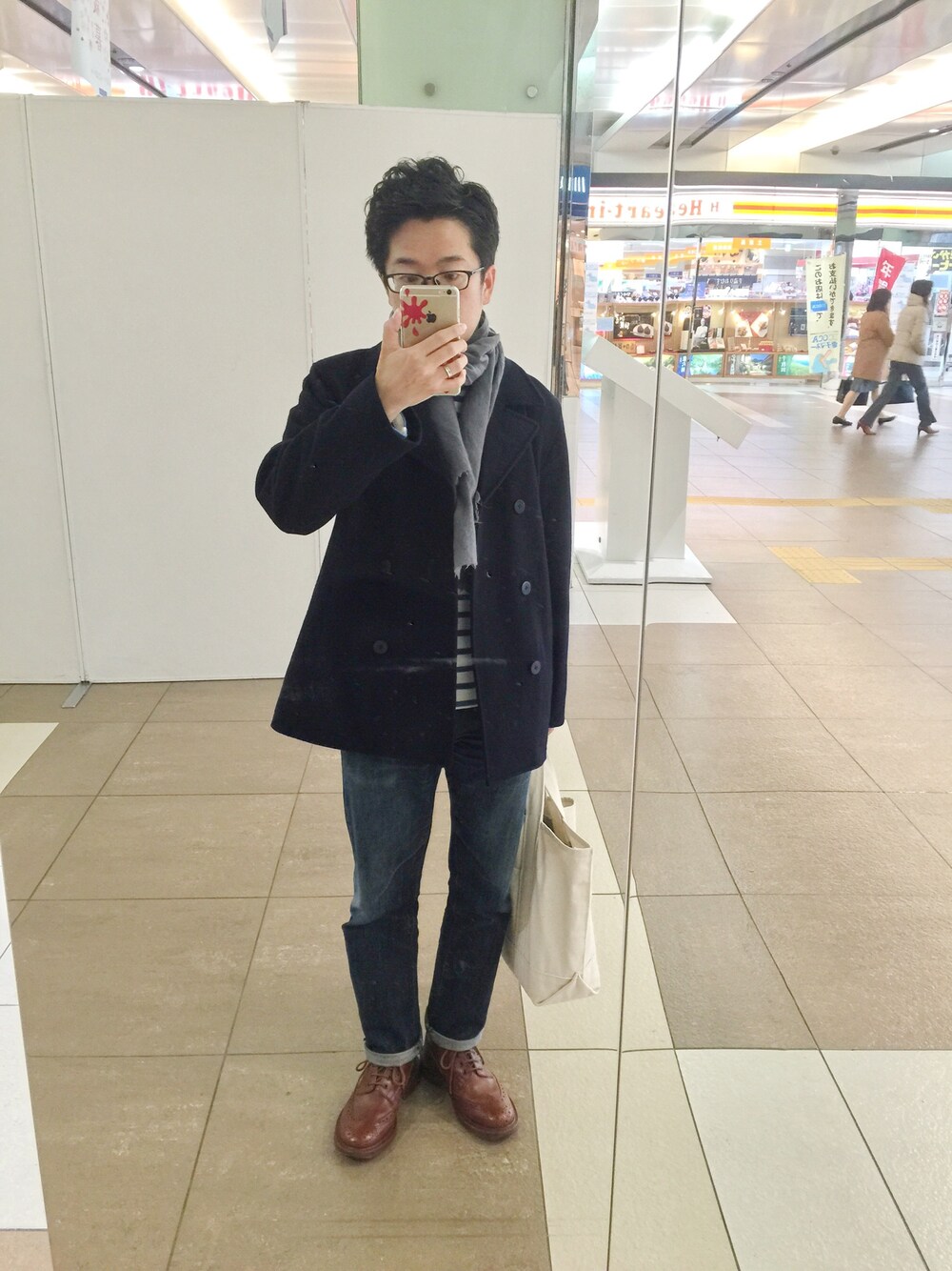 またも出張先(金沢)でパチリ。 人生で初めて買ったピーコートは、Brooks Brothersのボーイズ。金沢の寒さにも対応! GAPのボーダーロンT、UNIQLOのセルビッジデニム(5年くらい前のやつ)、トリッカーズのブーツ。 バッグは帆布を使って自分で作ったやつです。 冬ですね。