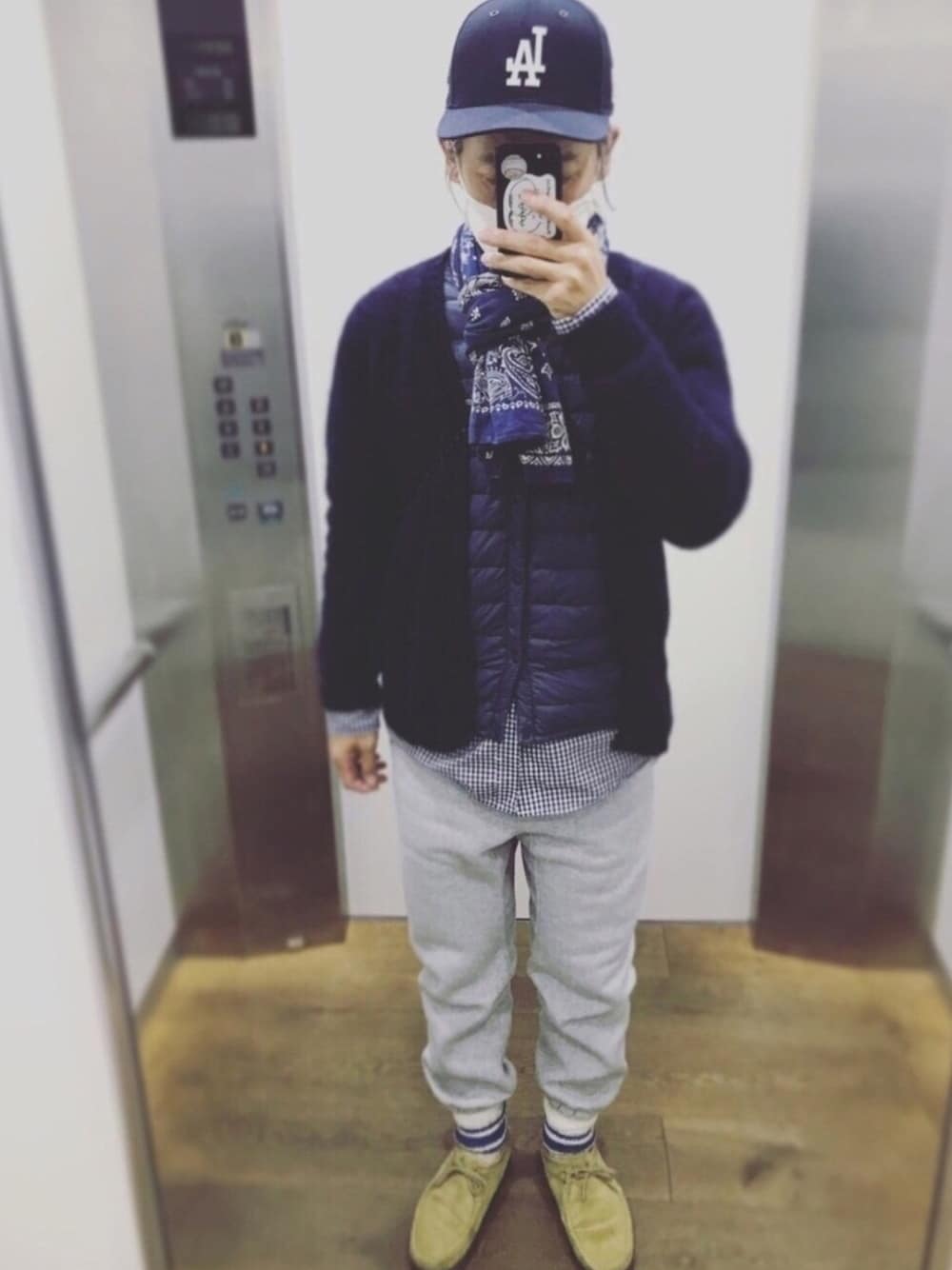 モヘア調カーデ×ボタンダウンシャツ×スウェットパンツのまた着てるコーデ。足元はもちろんワラビー。 寒い時はインナーダウンをイン。