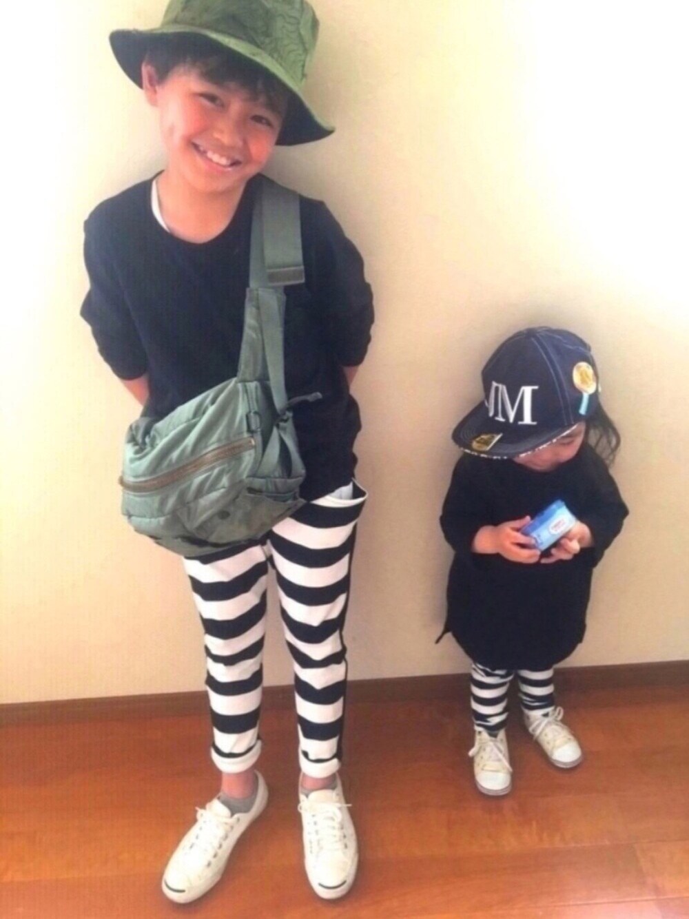おはようございます😃 見ていただきありがとうございます🙇♀️🙇♀️ 3月最終日🤹♀️ ボーダーパンツ👖 囚人みたい😝 弟くんのキャップ、お兄ちゃんが被ってて約6年前くらいの年季入ったやつです🤗 小窓➡︎弟に付き合わされて、謎のお酌🍻ごっこです😅 今日のピックアップタグのスプリングコート姿も👬めっちゃ後ろ姿ですが…… いつも、♡&セーブ&フォローありがとうございます🙇♀️❤️❤️🙇♀️ HALU プチ反抗期中の9歳😏 SENA 魔の2歳児😈