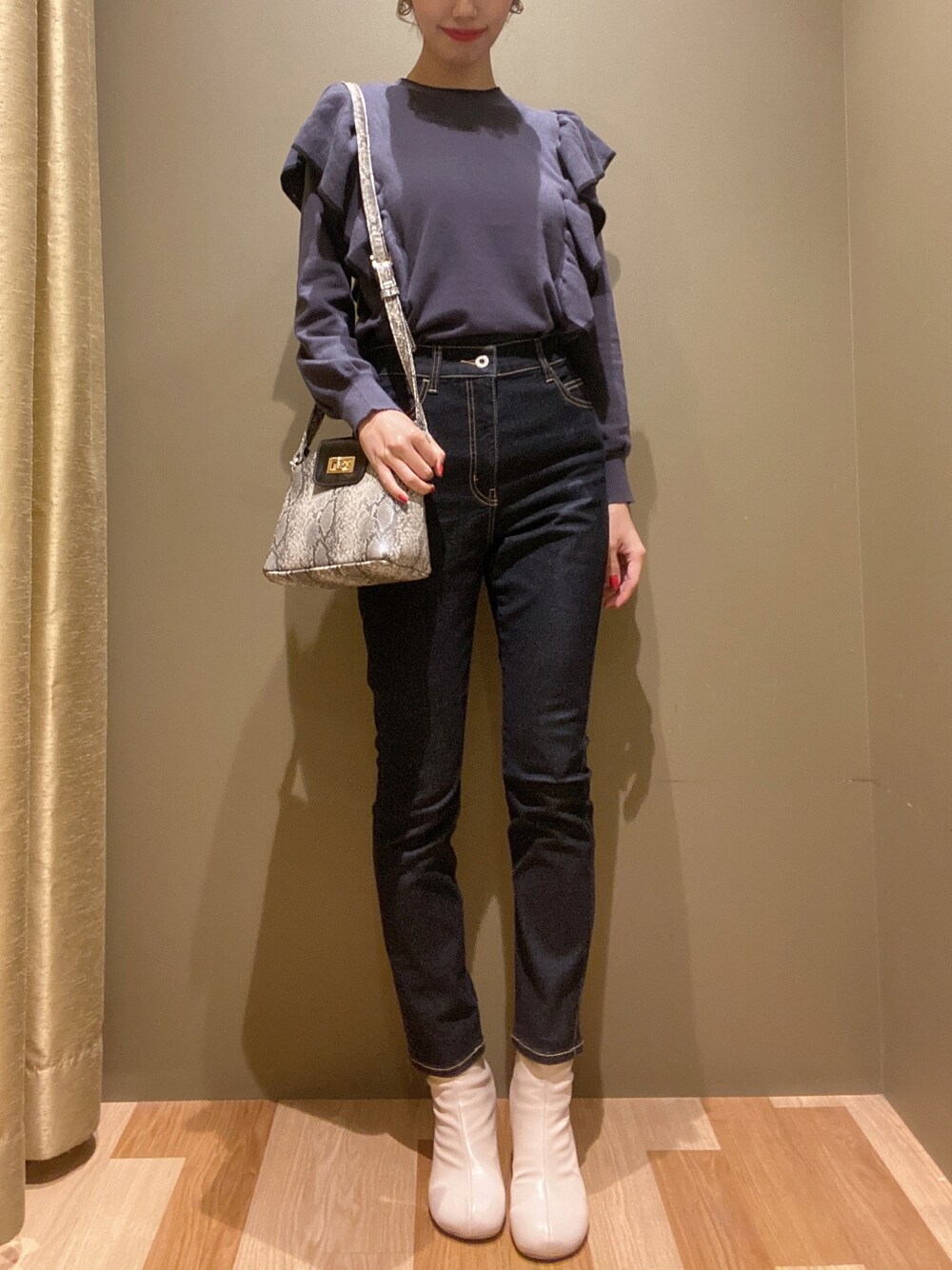 ご覧頂きありがとうございます🙇♂️!!✨ 普段フリル系はあまり着ないのですが、このニットは控えめな可愛らしさに一目惚れして即買いしてしまいました(笑) 着用後のフリルの広がり方も抑えめで、めちゃくちゃ気に入っています! キレイ目にもカジュアルにも、ボトムス合わせ次第で無限に使えそうなので、今から色々コーデを組むのが楽しみです^^ 今回はハイライズ(脚長効果あり!)のデニムスキニーと白ブーツを合わせて大人カジュアル風に。