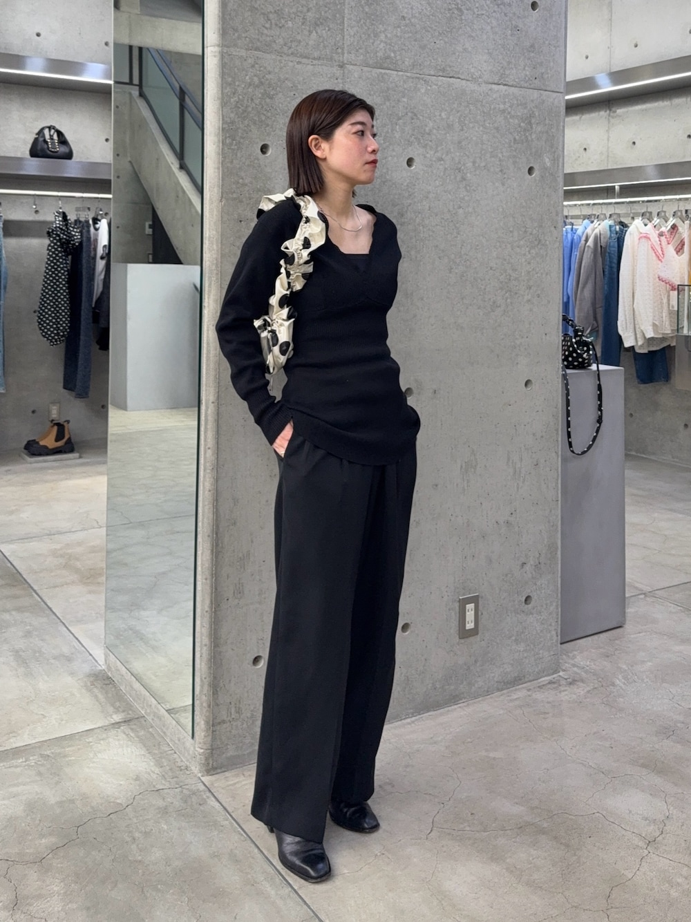 落ち着くオールブラックに、ドットのクシュクシュバッグでワンポイントを🍒