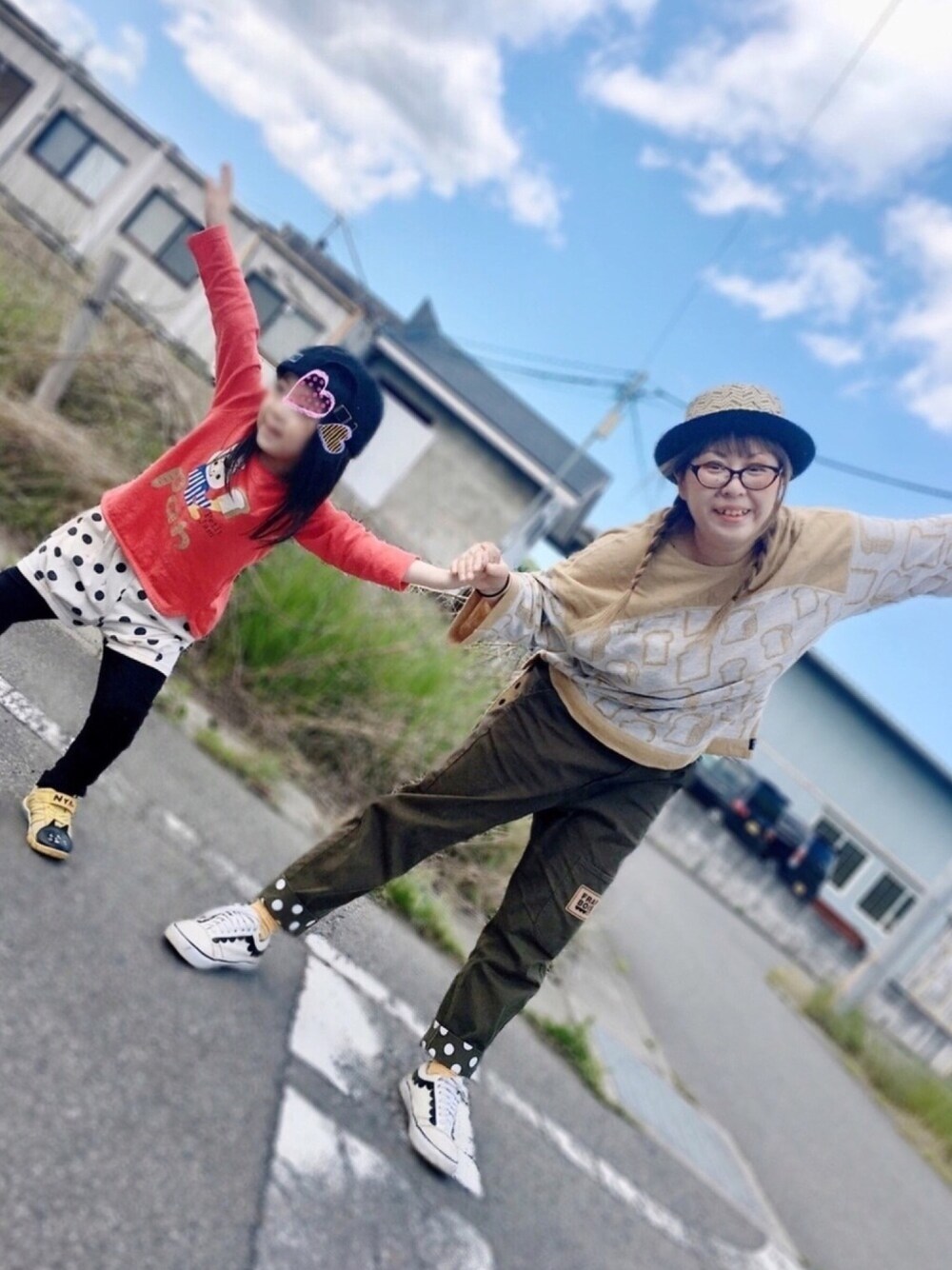 🍞パン母ちゃんと🍞パン子供、ボトムスにドット、スニーカーイエローで親子リンク👩👧 身体がなまってるのでたまにウォーキング(途中からゆったりお散歩歩きになるけど😅)に行きます🚶♀️💭💭💭 娘氏は毎日自分で着たい服を選んできます。今日はpetit jamのPanのロンTだったから(🍞来たね、久しぶりに😌)となって私もネネットの食ぱんジャガードにしました。 庭先で謎のポーズで「歩くぞー💪‼️」と気合い入れ、その後5600歩くらい歩いてきました。