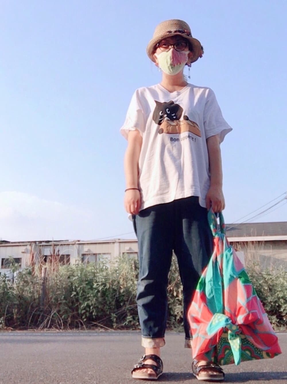 にゃーは可愛い🐾 バゲットは美味しい🥖 蓮の花は暑い夏の日の朝に「ぽん!」て音をたてて咲く💓(とか咲かないとか) 先日蓮見に行った時毎年寄るベトナムコーヒーの美味しいお香や手拭いなんかが売られているすっかりお互い顔馴染みになった売店で買ったカヤの蓮柄の大判ストール。 これが可愛くて気に入ってヘアバンドにしてみたり今日はバッグにしてみたり😊 コーデはあえてシンプルにTシャツにデニム👕👖麦わらのリボン、マスク、蓮のユラユライヤリング、そして今日の主役のバッグのピンクを生かしたくて🎀💕(イヤリング片っぽマスクに引っかかってる😭) ゆるくだるだるにして夕飯買いに出かけたのに日本酒と〆鯖カゴに入れてました🍶🐟☺️