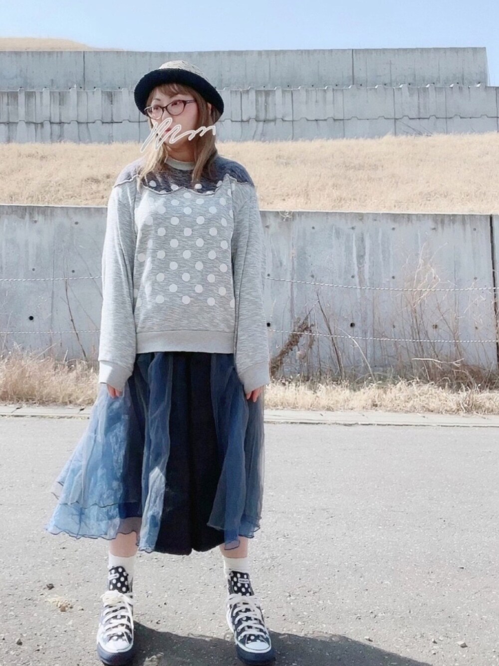 あったかくてストローハット👒 水玉だらけ。 グレーとネイビー合わせです🐭💙