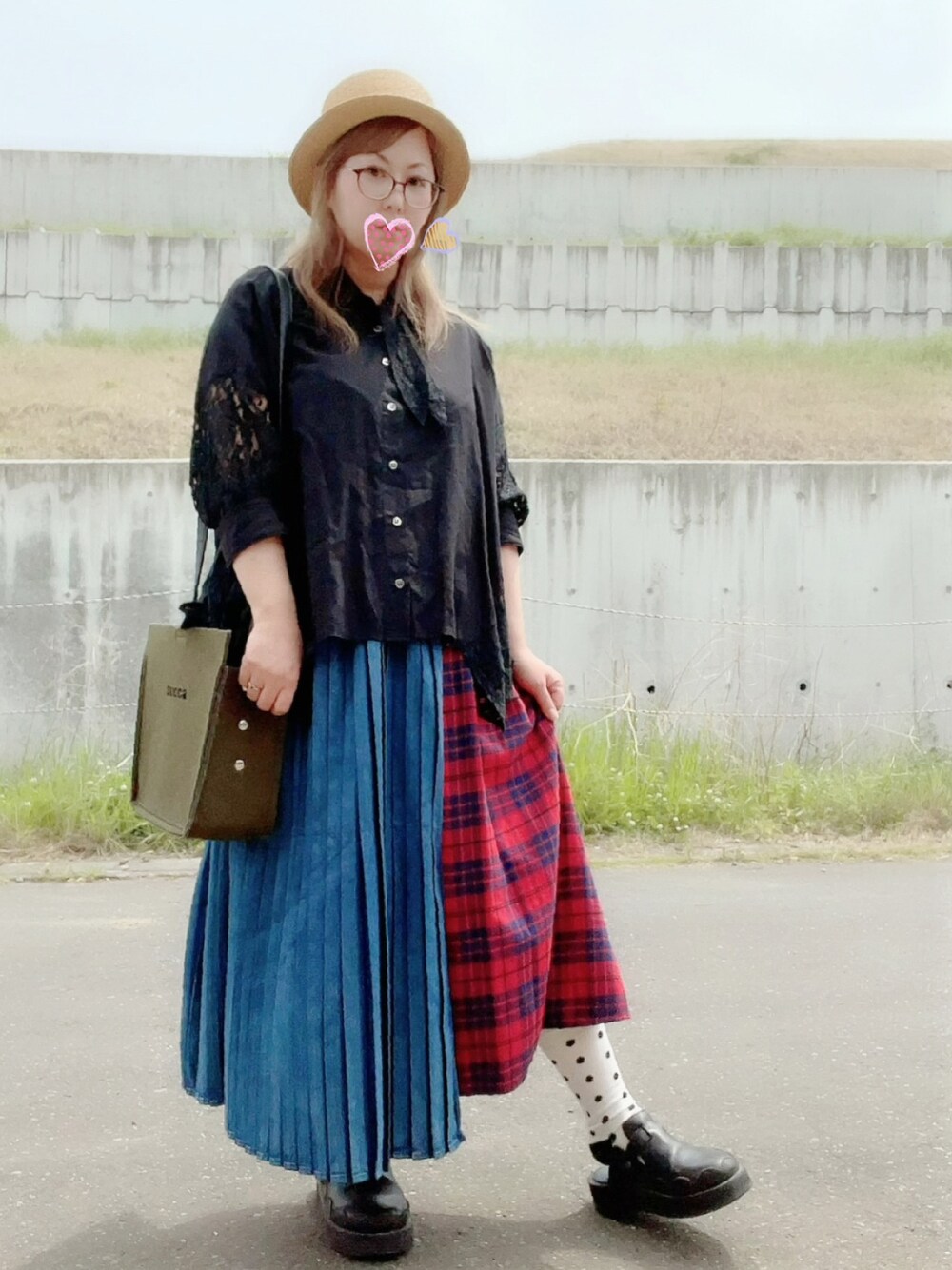 もう夏物投入な装いー👒🌞 千鳥カンカンハットの千鳥と反対側向いてしまった🐦…。