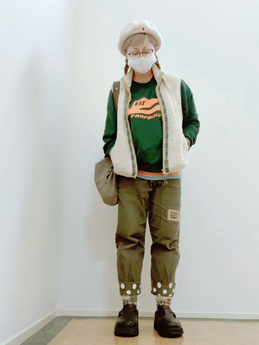 えらい寒くなったなと思って久しぶりにネネットのもこもこベスト🐑をブラニフのスウェットに羽織りました。 凄く暖かくて着回しも効くので長く着てます。個人的に配色バランスとか好きな格好になりました(この日ハロウィンだったのでかぼちゃ🎃意識しました) パンツもしょっちゅう履いてるお気に入り。ロールアップしすぎてしまったー😳///// く、く、靴下見せたかったんだもんね🧦💦
