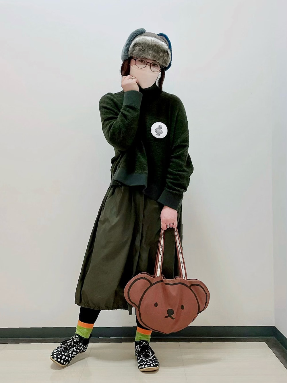 ワンピースみたいだけどセットアップなんです 黒に見えるけどカーキです💚 ボリスのトートは今年買って良かった物のうちのひとつ この一年あちこち一緒によく歩きました🐻