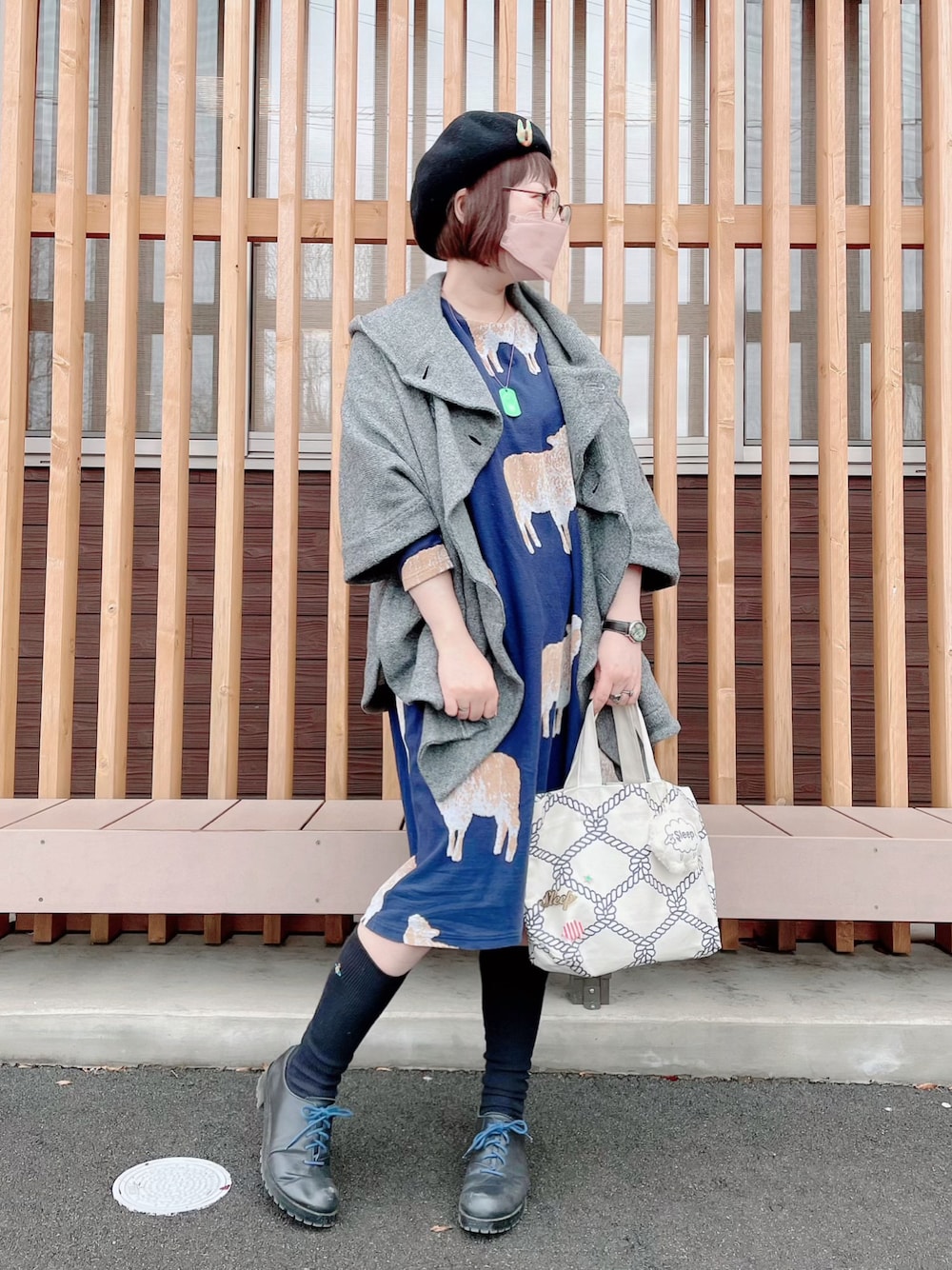 従姉妹の手作りのうさぎさんブローチをベレー帽に🐰🥕 ひつじさんをワンピとトートと腕時計に🐑🌱 夫と色違いのgommeのポンチョはとても暖かい☺️ この日は夫と月一のデート 前日から何を着ようか考えるのが毎回楽しいです🤔💭💕