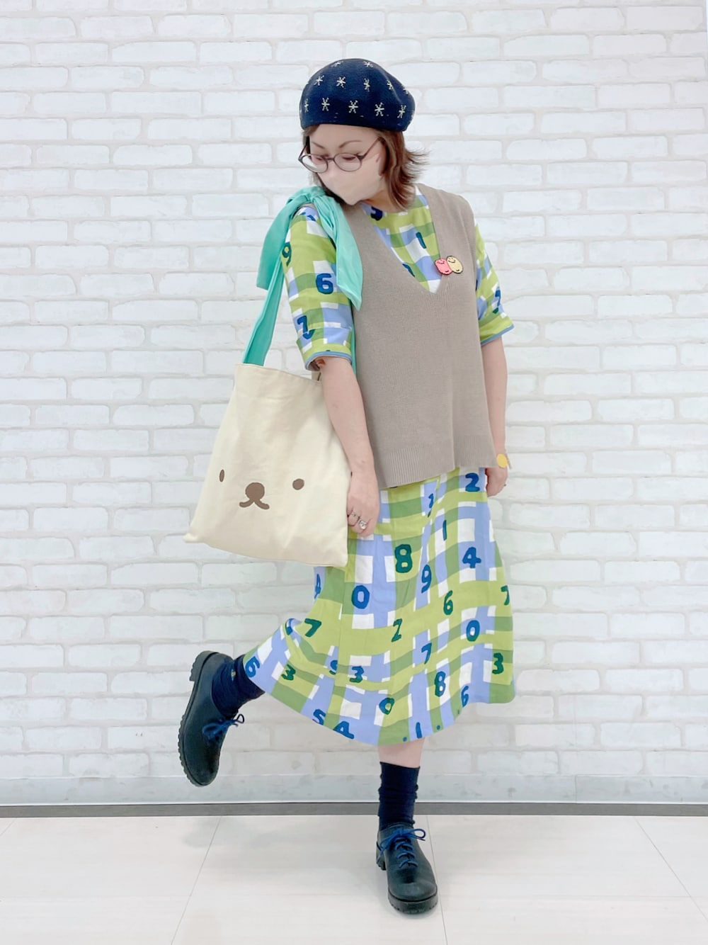 ボリスのトートをおろしました🐻 リボンがかわいいです💚 ワンピには初秋意識してベストを重ねヘアピンワンポイント 頭と脚先はネイビーにしました🟦 お祭りに行ってもう10年近く聴いてるDOTAMAさんのライヴ楽しんできました🎶′-4枚目はDOTAMAさんが撮ってくれました🤭💕