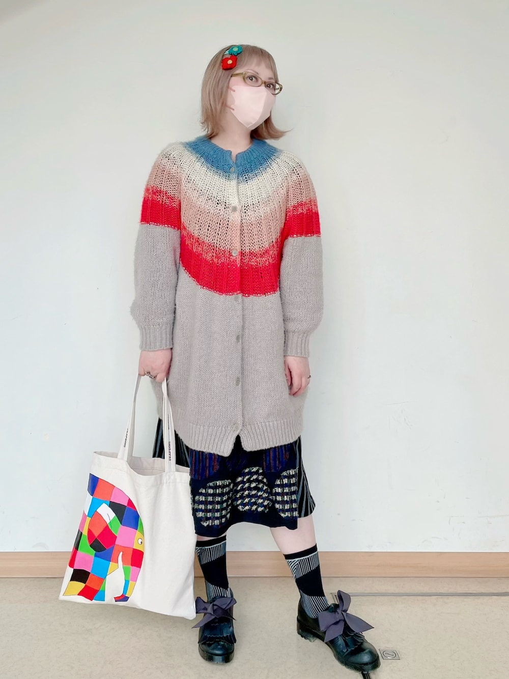 Tommy february6が昔からずっとずっと大好きで遂に彼女と全く同じモデルの眼鏡を手に入れたので… …なりきりコーデって難しいから自分が大好きなコーデを過去から拾って少し変化させました モヘアカーデコートのグラデーションをヘアピンにも💙❤️ エルマートートでカラフルにしました🐘 マカロンが大好きなのでそこだけなりきりTommyかな😅
