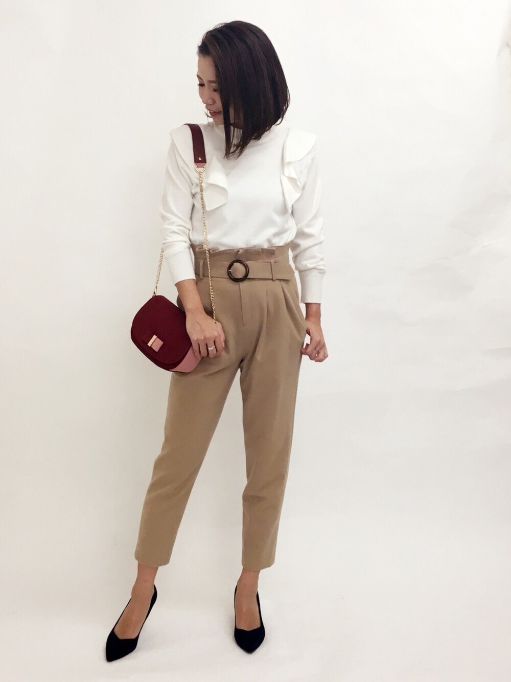 しみおのニット/セーター「フリルハイネックプルオーバー」を使ったコーディネート