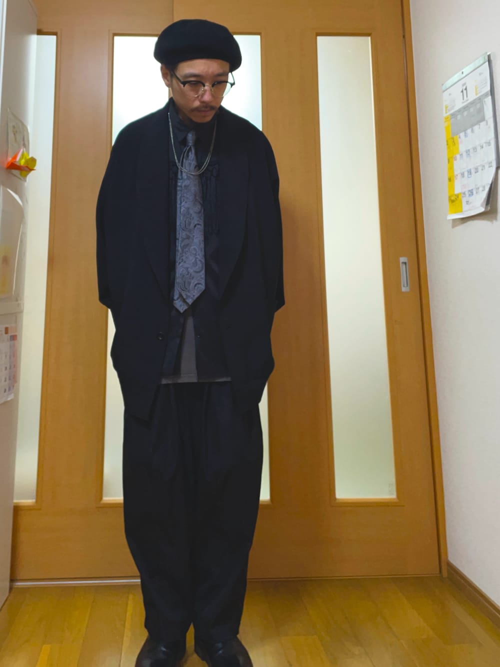 全身ブラックをベースにデザインや素材、ドレープ感で奥行きを出しました。 ネクタイ、ネックレスでシルバーグレーを差し色にしてます。