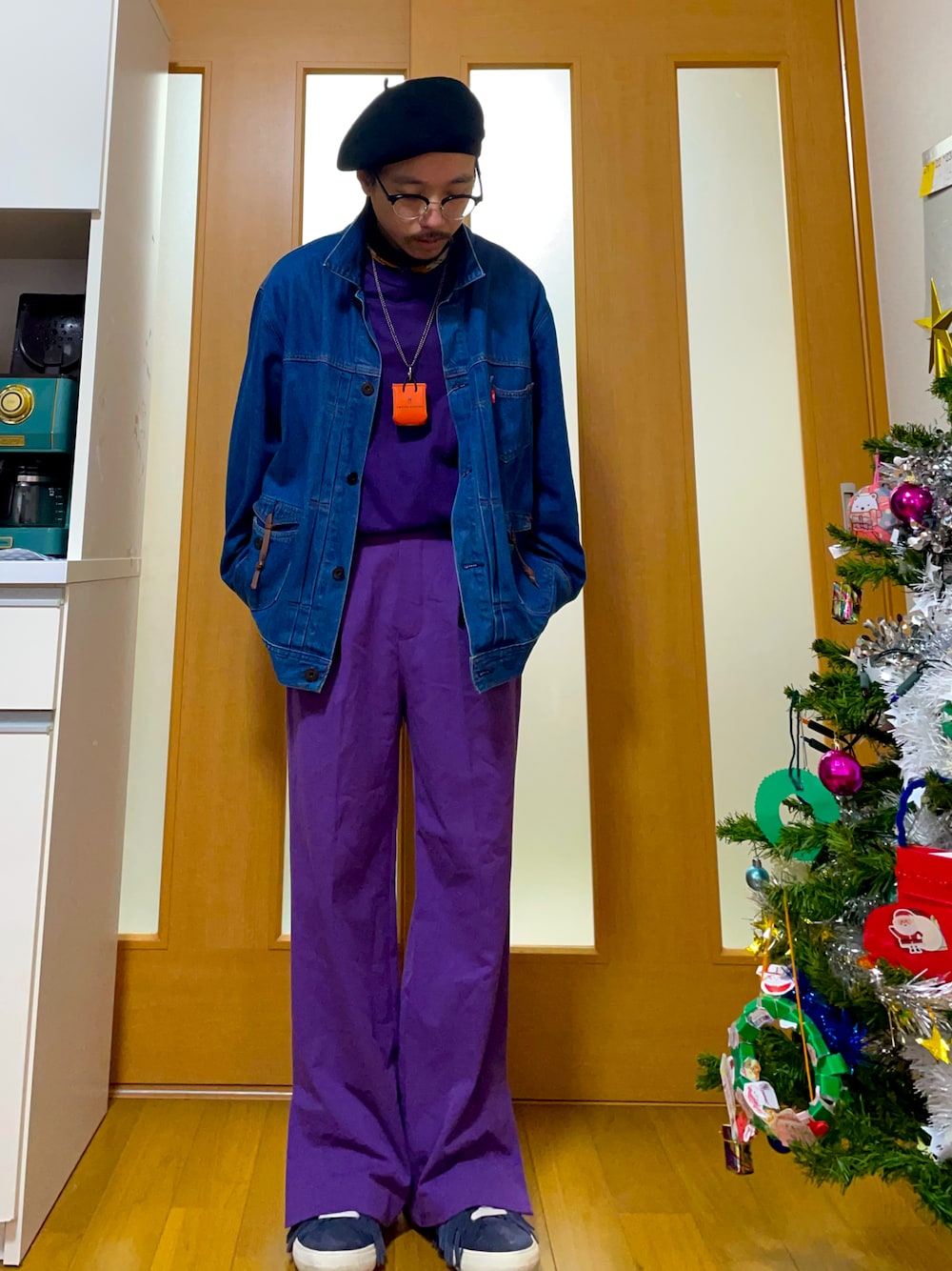 紫×紫をトーンを変えて合わせてオーナメント風にしました。オレンジをソックス、ベルト、チャーム、スカーフで合わせましたがかなり奇抜になるためGジャン、シューズの青で馴染ませました。 フリンジやGジャン、フレアパンツでウエスタンな雰囲気を、2枚目のヨシオクボのアウターでモードな雰囲気を出してます。