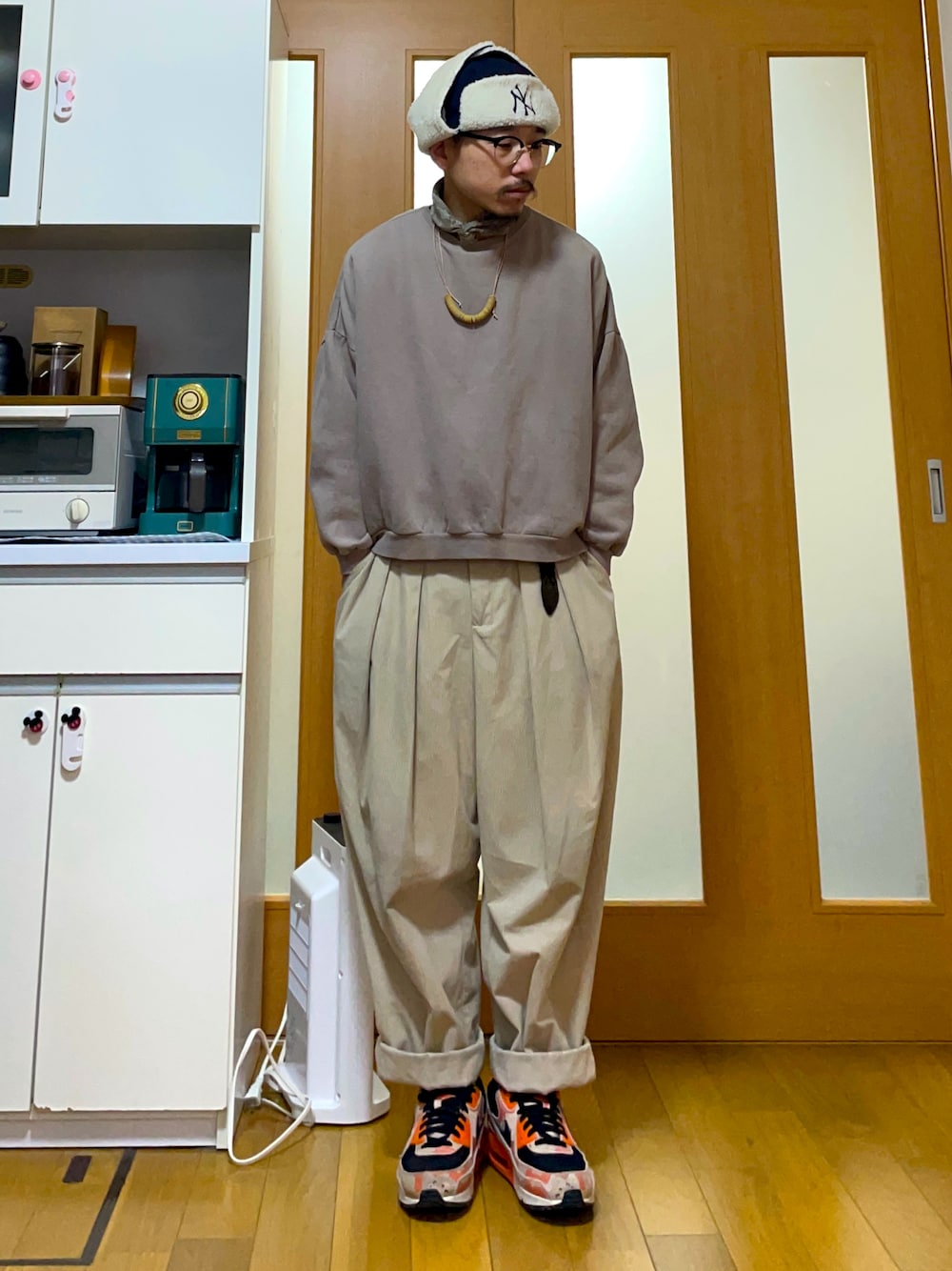 アースカラーのトーンオントーンにダークトーン、オレンジのアクセントを入れました。 異素材と柄合わせで奥行きをつけました。