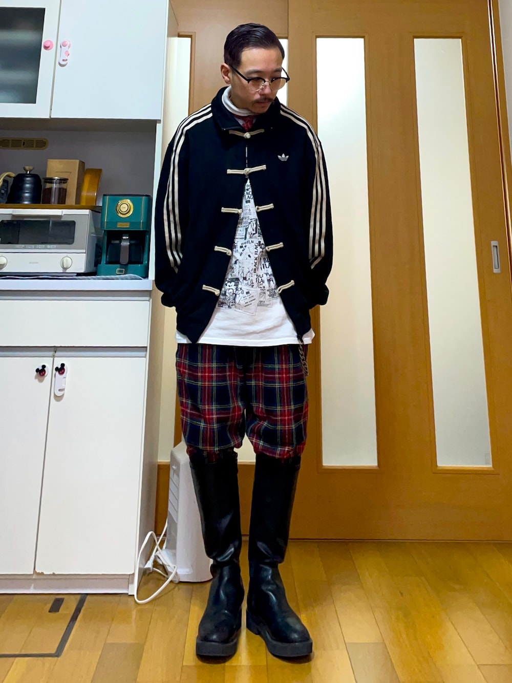 パンクといえばの赤タータンチェック、ブラックフラッグのTシャツにアディダストラックジャケットをナポレオンジャケット風に合わせグラムロックとパンクを合わせました。タートルネックにチェックバンダナ合わせやロングブーツイン、トラックジャケットのボタンディテールでモードに仕上げました。