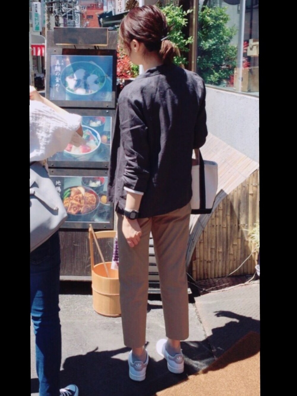 春の浅草食べ歩き。homeworksの柔らかリネンシャツの下に無印のボーダーカットソー着てます。