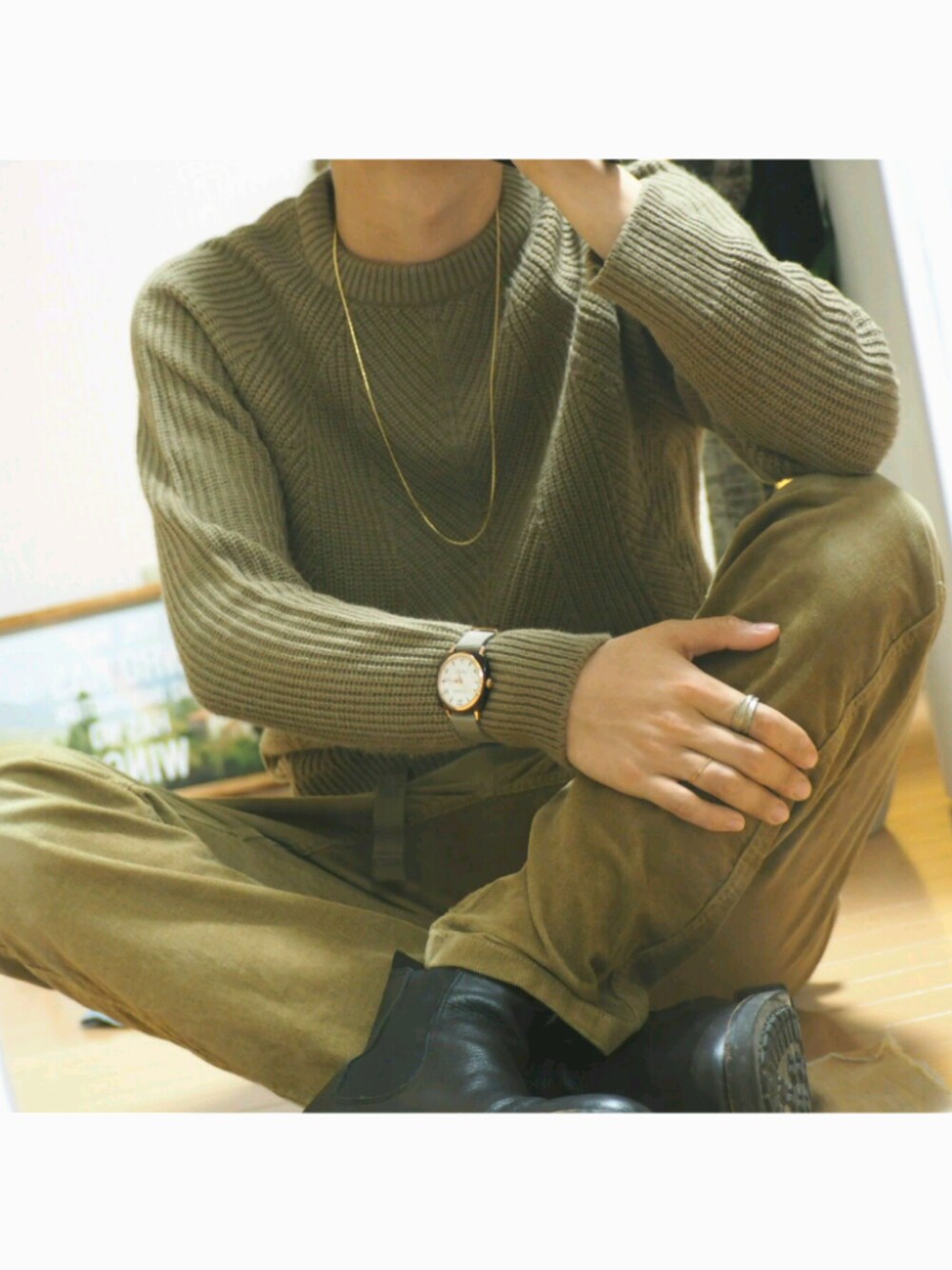 同色系コーデ🍁 ブラウンニットとベージュのクライミングパンツを合わせました。 小物のゴールドをアクセントにもってきました。