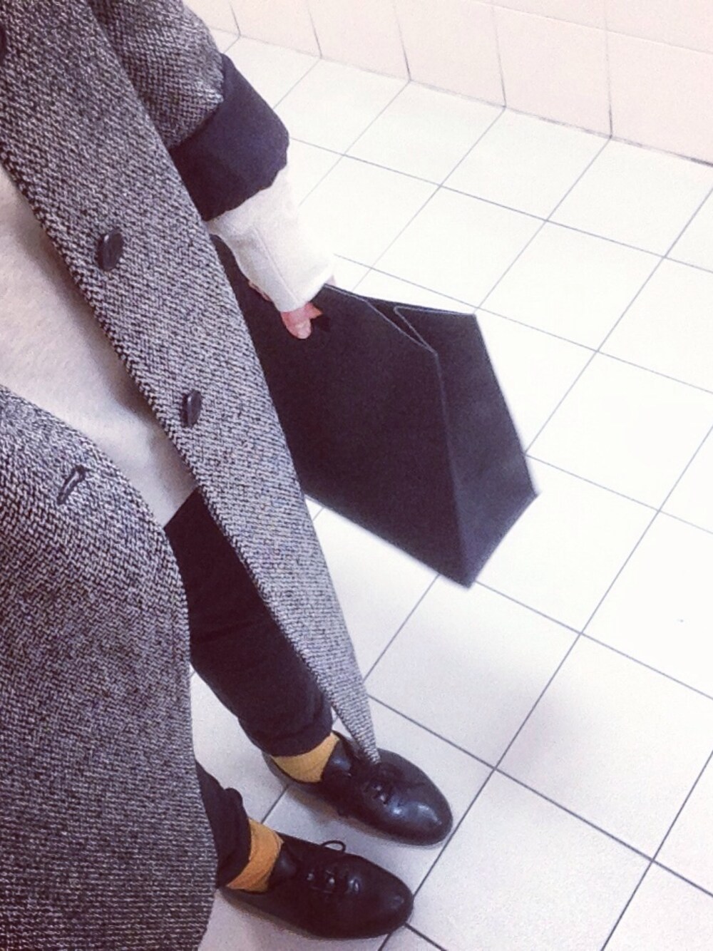ブラック系のバレエシューズを着用したレディースの冬コーディネートの1枚目の写真
