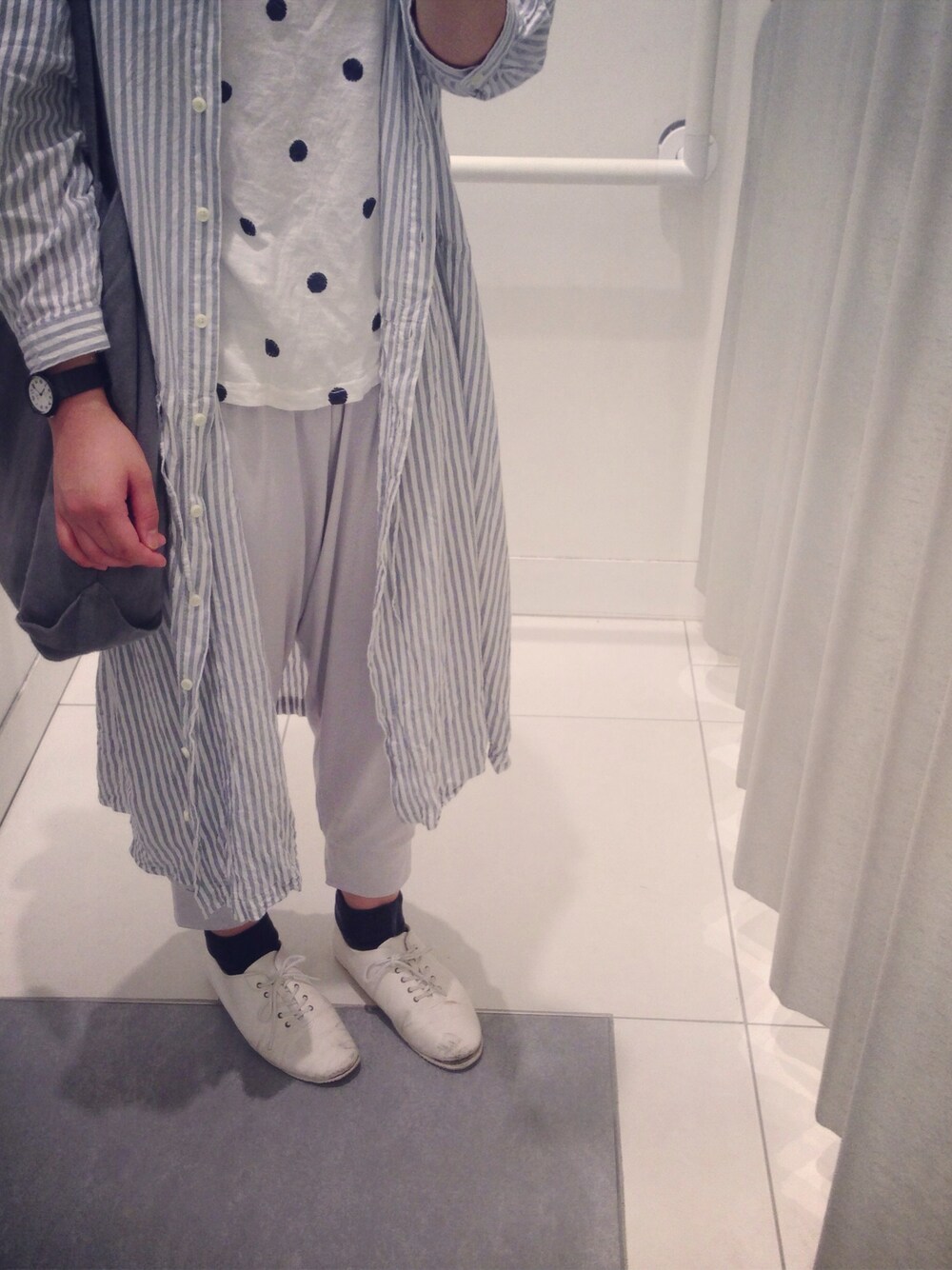 ホワイト系のバレエシューズ、グレー系のトートバッグ、ブラック系のアナログ腕時計を着用したレディースの冬コーディネートの1枚目の写真