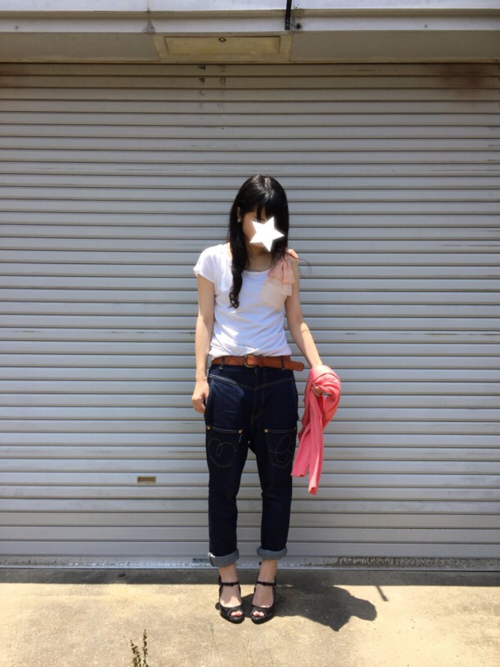 天気いい!! シンプルすぎますけど このアシンメトリーなTシャツお気に入りです☻ メルシーのサルエルをヒールとピンク差し色でカジュアルダウン!のつもり!