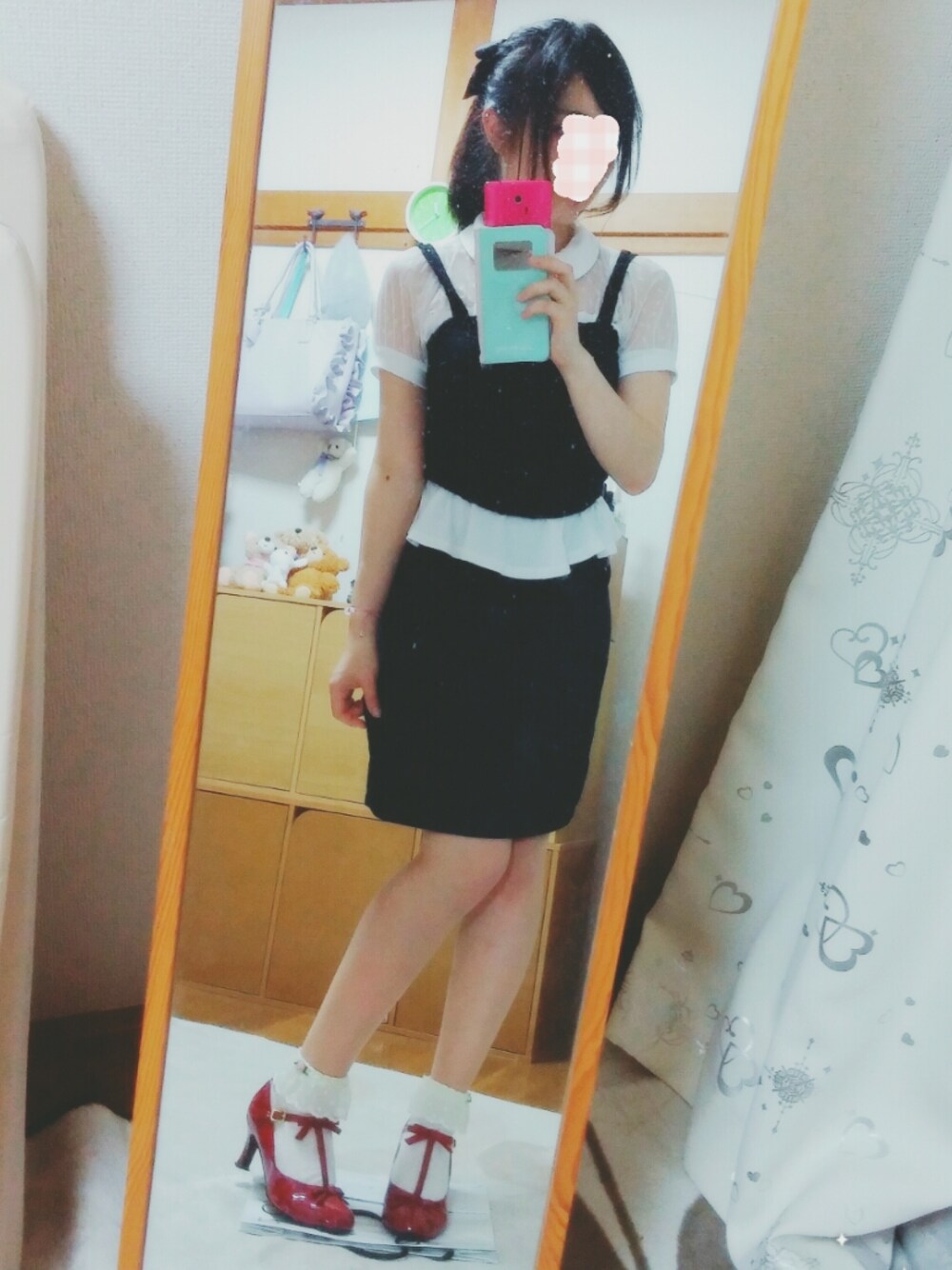 かっちりお嬢さん的な。 モノトーンでまとめて差し色で赤。 足元は王道ガーリーって感じ。笑 白に赤い靴はお気に入り。 トップスの裾がフレアーだったのでビスチェと合わせるとふわーっと広がって可愛いです。