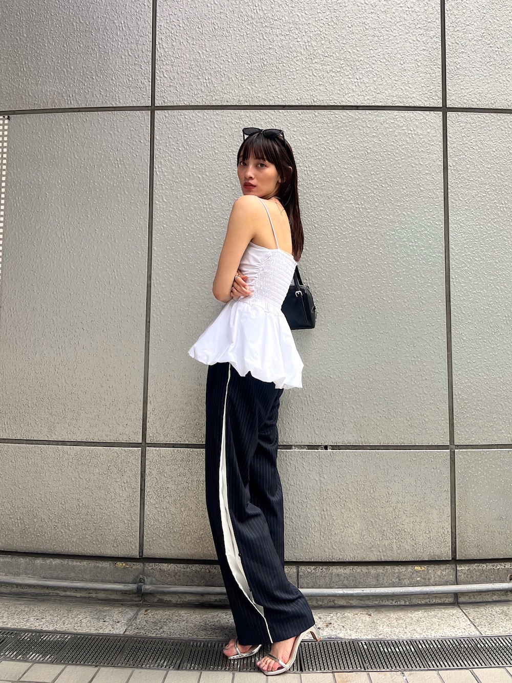 ⚪︎ビスチェ(OFF/サイズF) トレンドのバルーンビスチェです♡コンパクトに着るデザインですが、背中部分がシャーリングしているので中にTシャツも着られます◎ ⚪︎パンツ(NVY/サイズ②) 大人気のパンツがアップデートしました!裾のボタンを取ると写真みたいにラインがしっかり出るデザインになってます! 是非参考にしてみて下さい♡♡ Instagram▷▷@misaki_kubozono wear▷▷ @312misaki tiktok▷▷ @misaki_kubozono