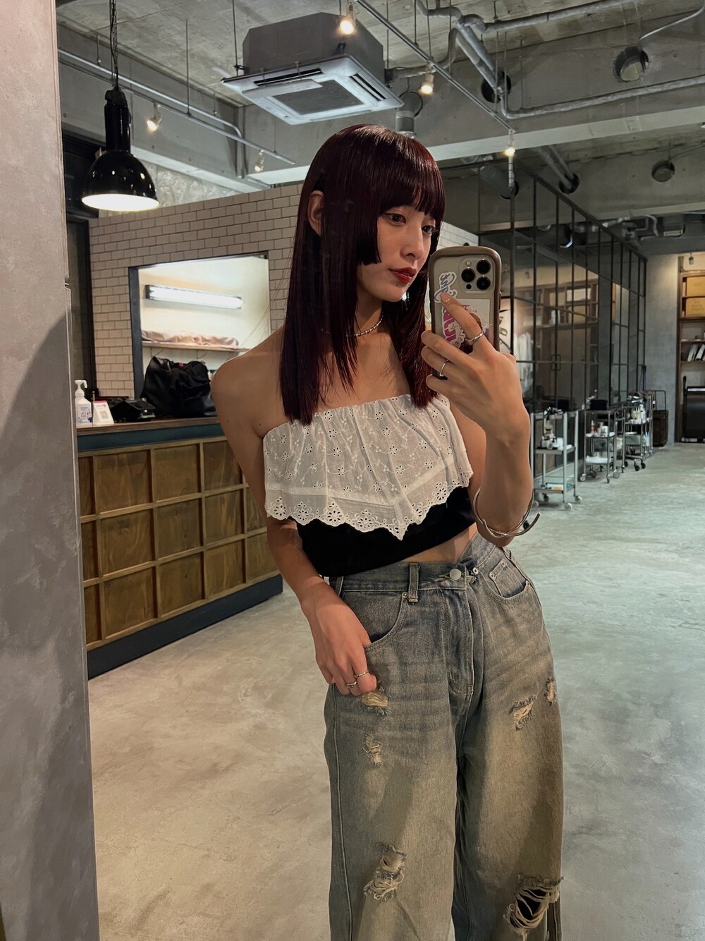 ⚪︎トップス(BLK/サイズF) 胸元のコットンレースが可愛いバンドゥのトップス!秋はカーディガンやジャケットのインナー遣いにも◎ ⚪︎デニム(BLU/サイズ②) ウエストがダブルボタンになっているのでサイズもベルトなしで調整ができます!ダメージも程よく入っているのでカジュアル見えしますが、肌見せも程よく履きやすかったです◎ 是非参考にしてみて下さい♡♡ Instagram▷▷@misaki_kubozono wear▷▷ @312misaki tiktok▷▷ @misaki_kubozono