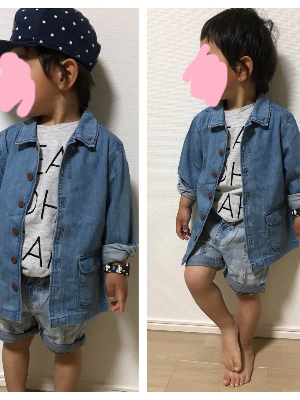 携帯壊れちゃってたから久しぶりの更新✏️ 今日はデニムオンデニム。 下の子とデニム✖️グレーで合わせました。 パパの腕時計が欲しくてしょうがなかった長男。 昨日、腕時計をパパに買ってもらってルンルンです♥️