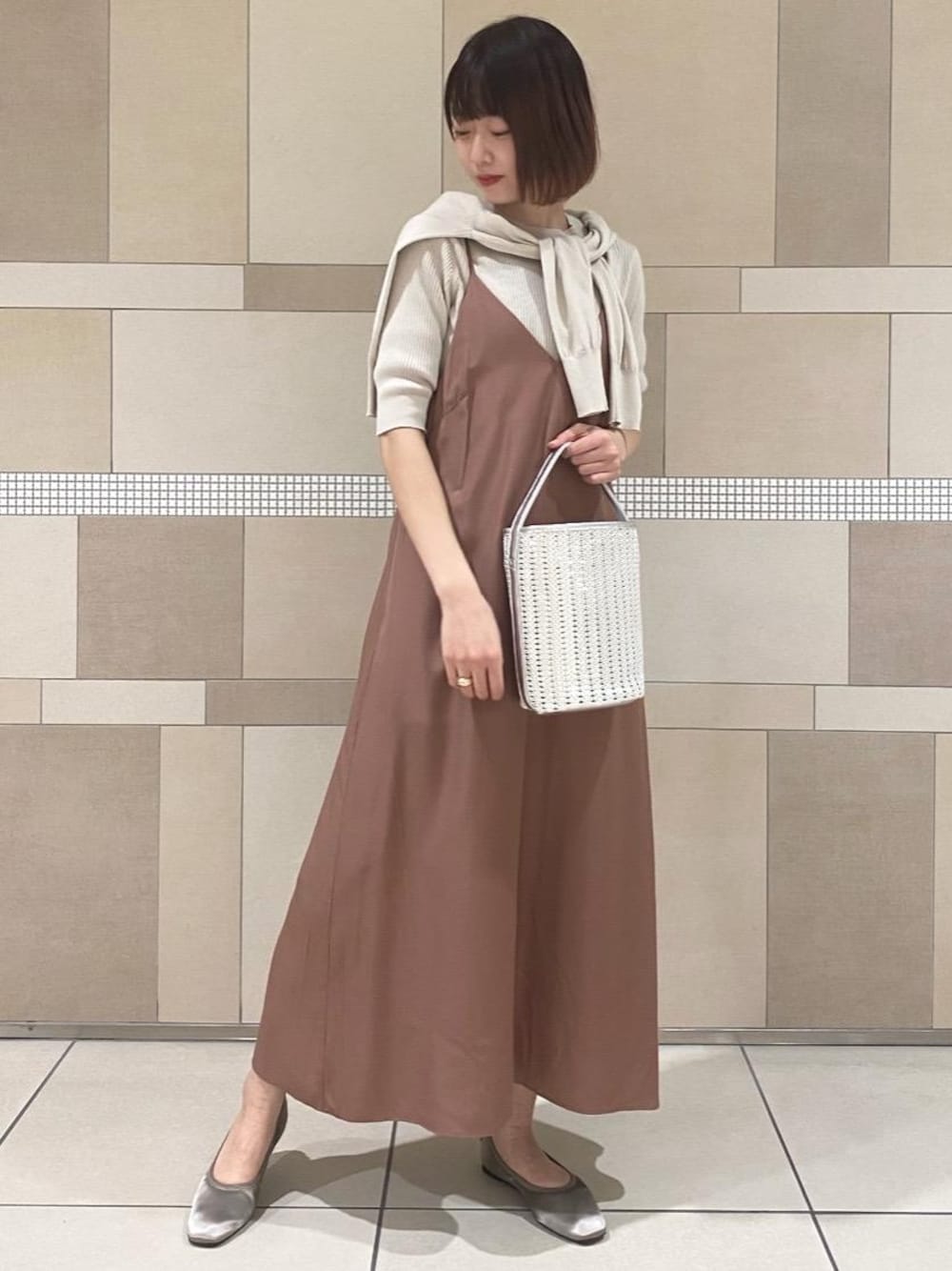身長168cm/シューズL/その他フリーサイズ ベージュ系で色味を合わせたワントーンコーディネートです。くすみカラーのキャミワンピはサテン生地で光沢があるので、カジュアルになりすぎず上品さを出すことができます。