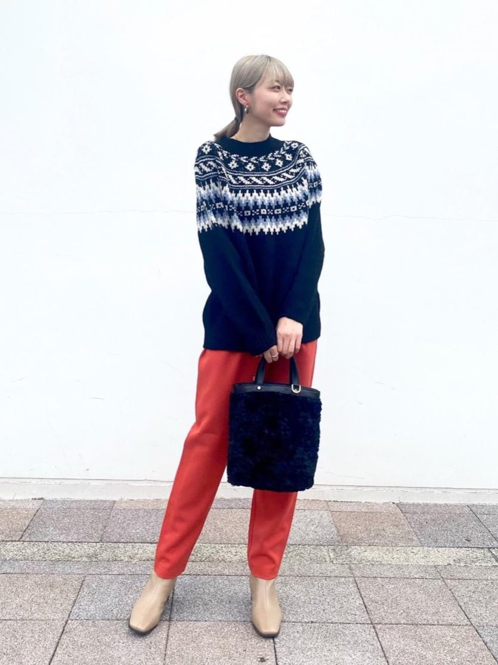 身長168cm 【普段サイズ】 トップス38/ボトムス38/シューズ24.5cm 【着用感】 トップス:ややゆったりめ パンツ:標準的 シューズ:標準的 【コーディネートポイント】 秋冬定番のノルディック柄のニットを主役に、季節感を意識した小物やパンツで合わせました。カジュアルになり過ぎないようにブーツを合わせて女性らしさをプラスしました!