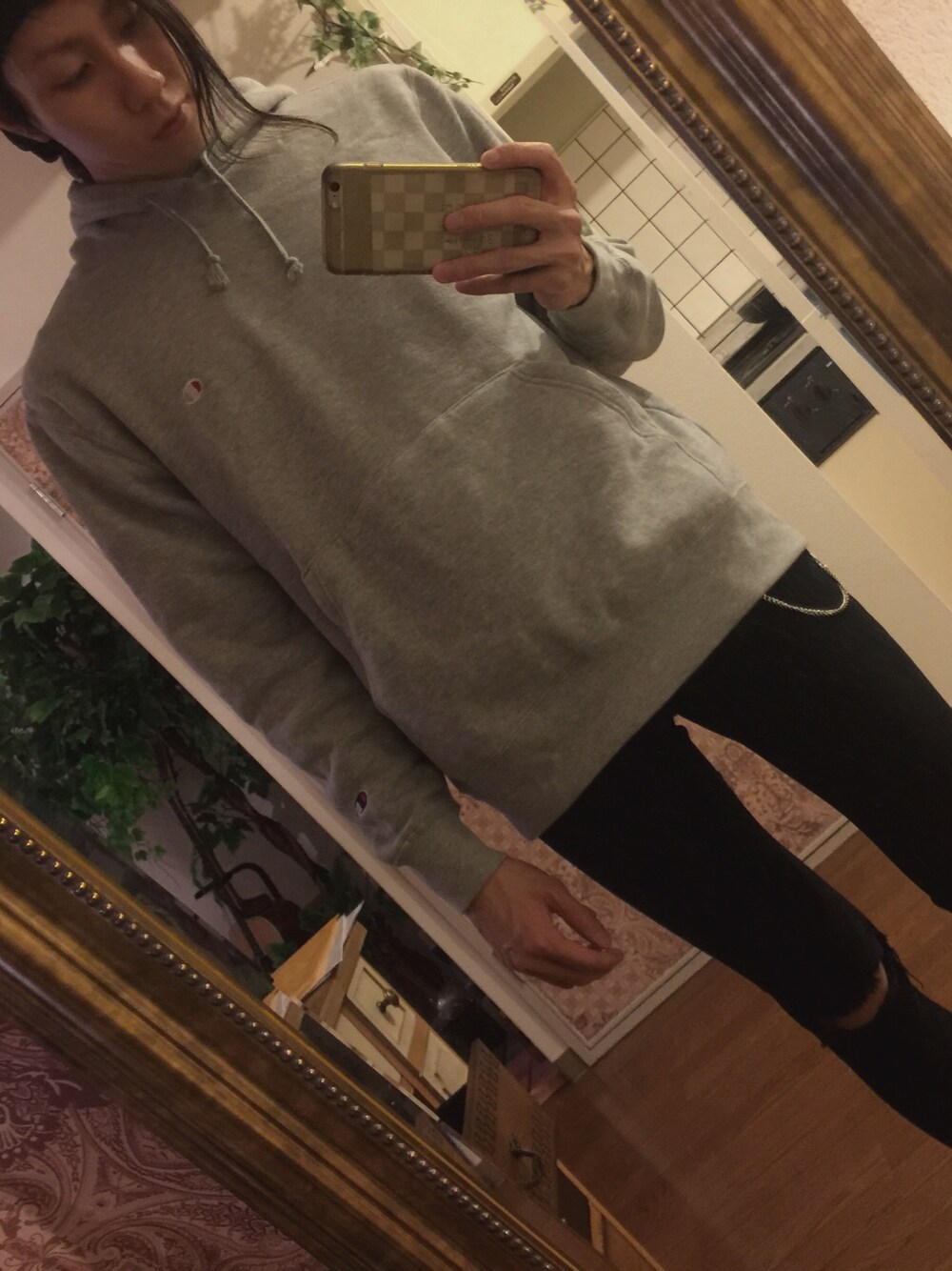グレー系のスウェット、シルバー系のネックレスを着用したメンズの秋コーディネートの1枚目の写真