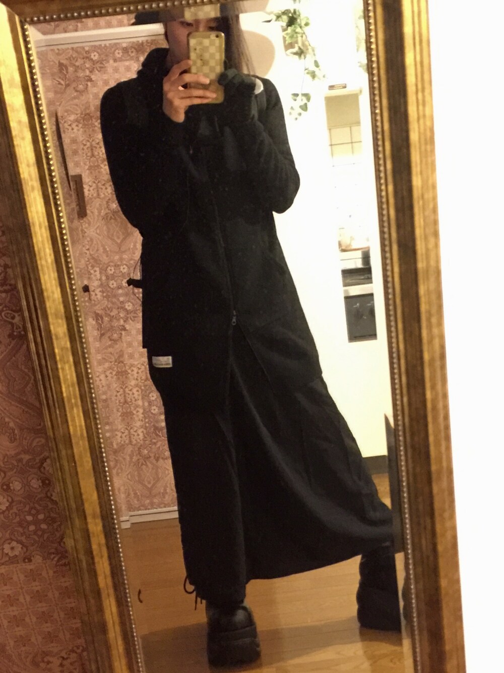 ブラック系のパーカー、ブラック系のスカート、ブラック系のスニーカーを着用したメンズの秋コーディネートの1枚目の写真