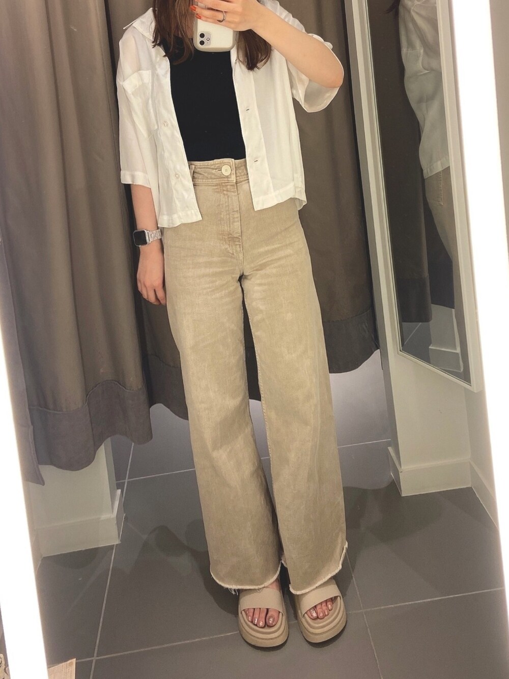 ベージュ系のパンツ、ベージュ系のサンダルを着用したレディースの春コーディネートの1枚目の写真