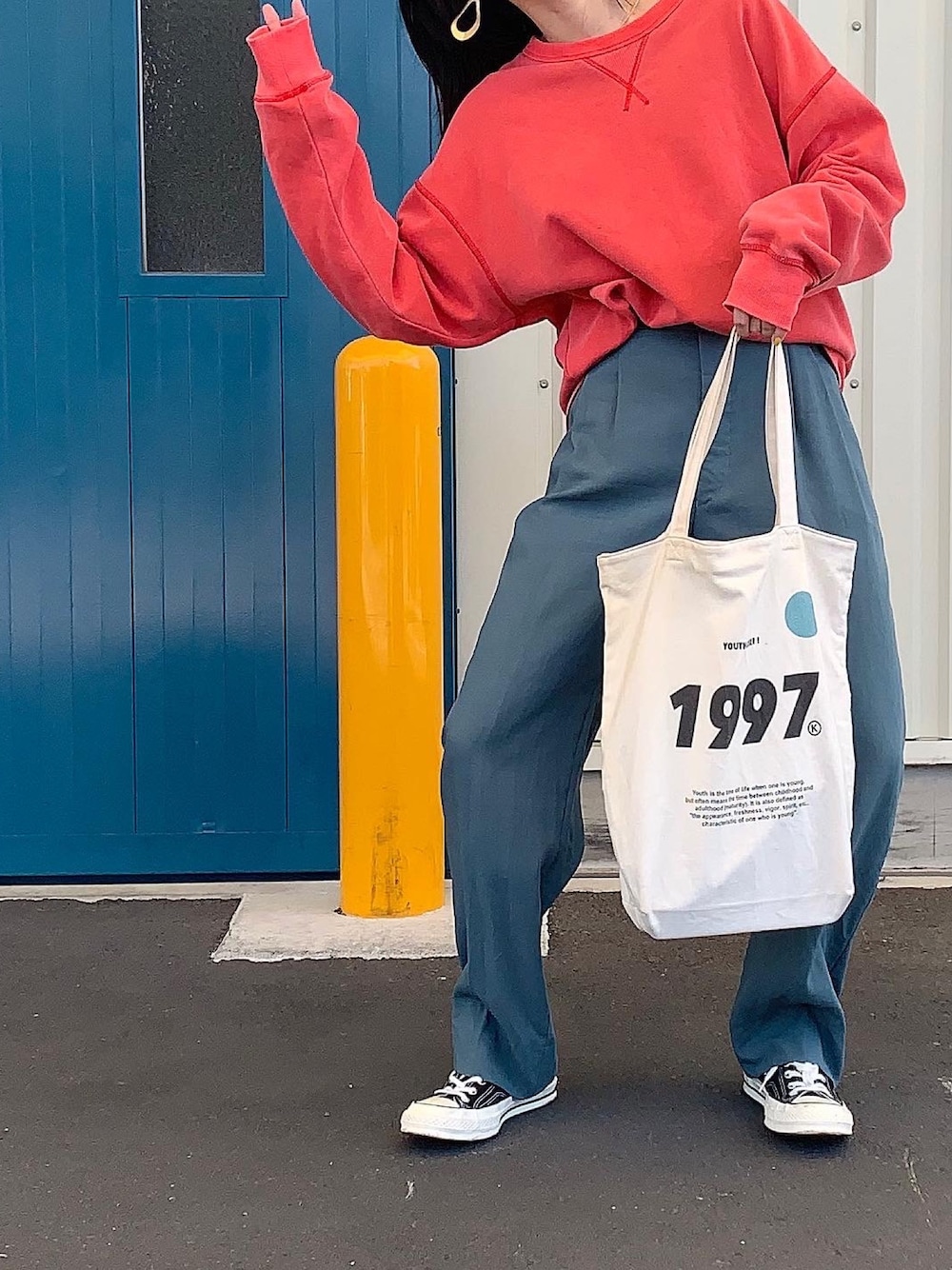 トレーナー ¥330 スラックス ¥330 トートバッグ ¥330 全て古着屋さんで購入 安すぎない?可愛すぎない? Youth loserのトートに古着屋さんで出会えちゃうとは思わなかった\♡/