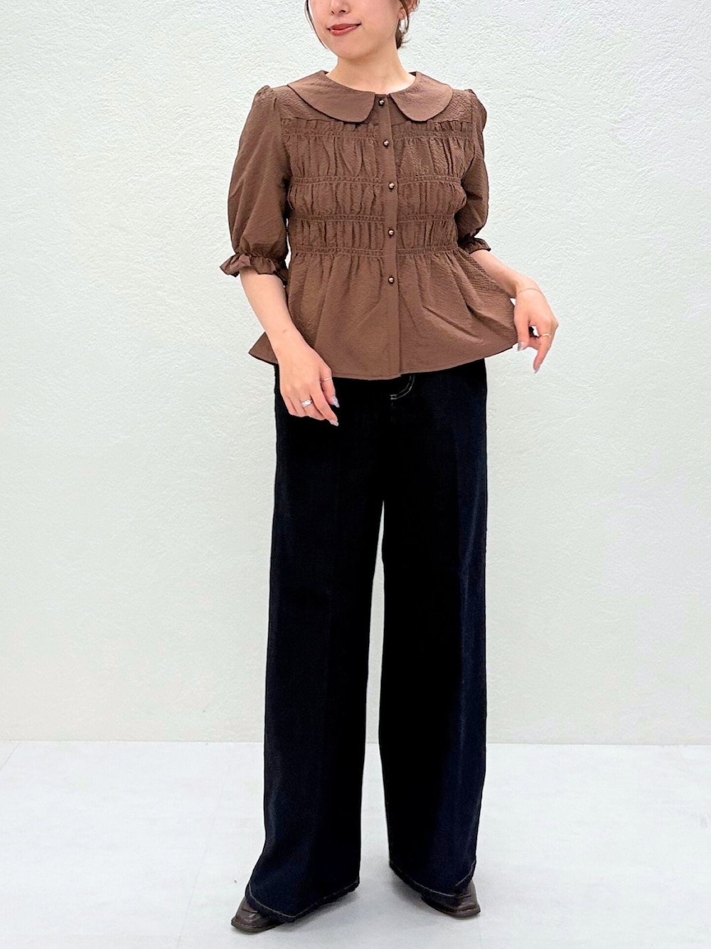 ペプラムデザインがウエストが引き締まりメリハリのあるトップスです🤎 暗めのデニムパンツ合わせで大人カジュアルを演出♪