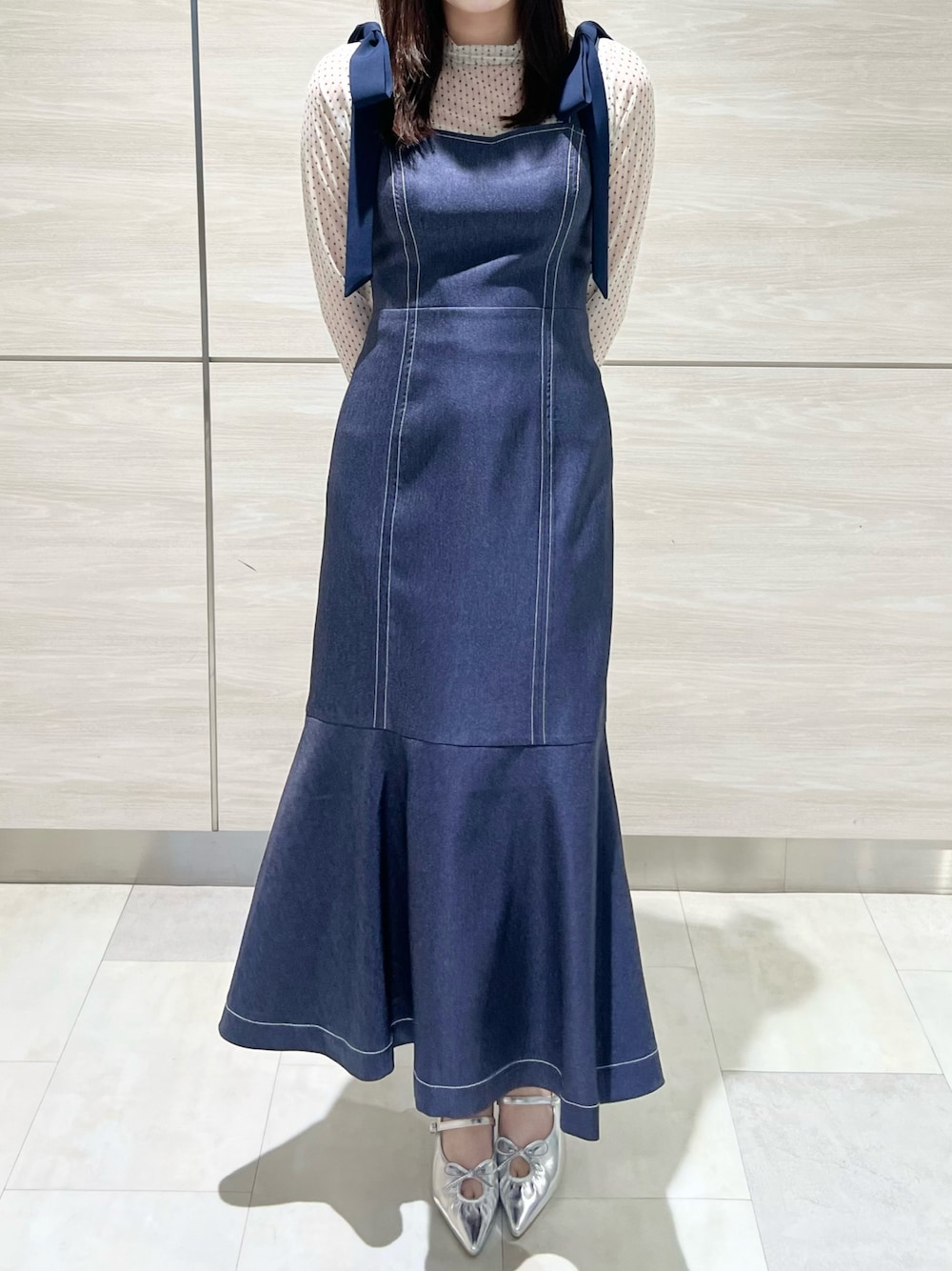 肩のリボンがガーリーさをプラスしてくれる👗✨インナーはドットにしてトレンド感あるコーデにしました☺︎
