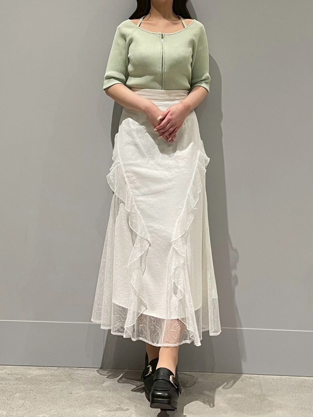 爽やかグリーン🫛とレースのフワフワスカートが可愛いコーデです♪