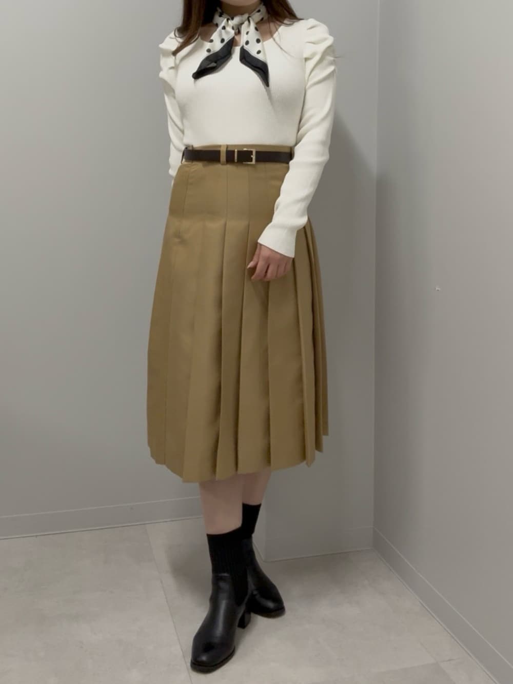 ニットのドットスカーフは取り外し可能♪ お持ちのトップスと組み合わせたりと、コーディネートの幅が広がります🎀 スカートはミディ丈で、低身長さんもヒール無しで綺麗に着ていただけます✨✨