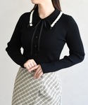 襟元にフリルがついたブラックで可愛らしいトップスに、 さりげない花柄で大人っぽい! フェミニン女子の完成です💐