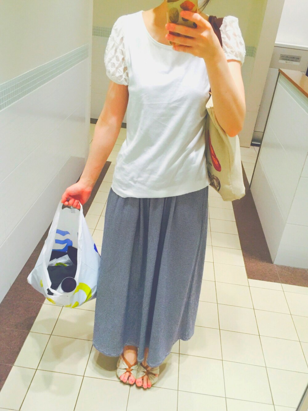 お久しぶりです(*^^*) ちょっと更新しない間に暑くて暑くて..☀️ 温度差にやられて風邪ひきました。(笑) みなさまお気をつけて! 今日のコーデ※※ 古着屋さんで買ったTシャツ。 袖がリボンの柄のレースになってて可愛いんです💓 涼しい🍃 スカートはリーズナブルなGUで買った ボーダーのマキシスカート。 SALEしてて、¥590でしたヾ(@⌒ー⌒@)ノ 最高です(笑) カバンは愛用のパンのトートバッグ! これがまた可愛い、、💓 かなりシンプルだしラフだけど こういう格好が楽でいいですね。
