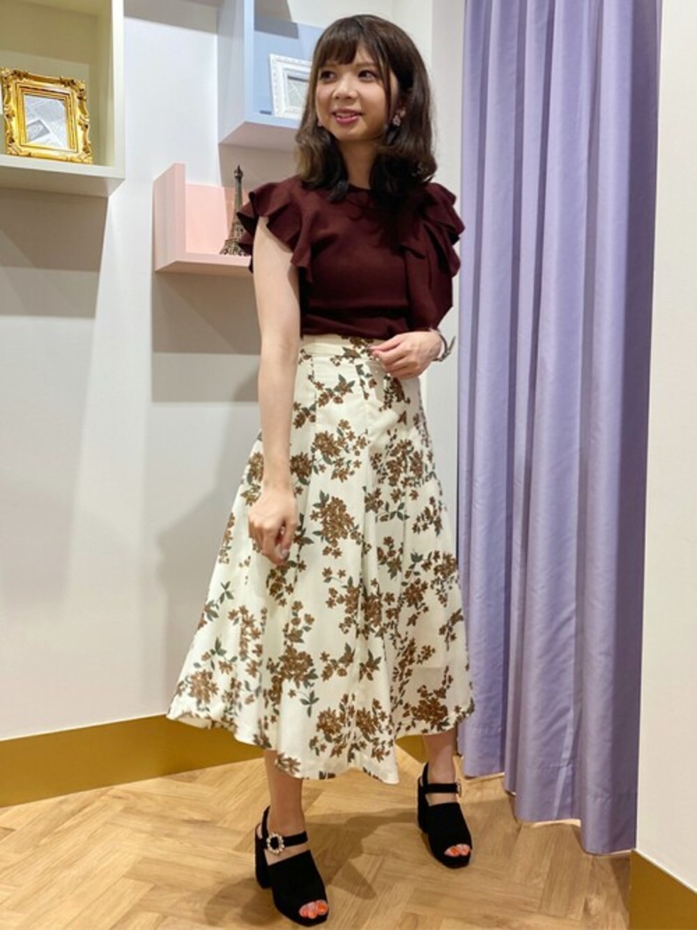 フリルと首元のリボンで上半身を華やかに魅せてくれるニットです♡♡ スカートは花柄で可愛いらしいけど、裾がアシンメトリーなので今年っぽいですね!
