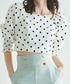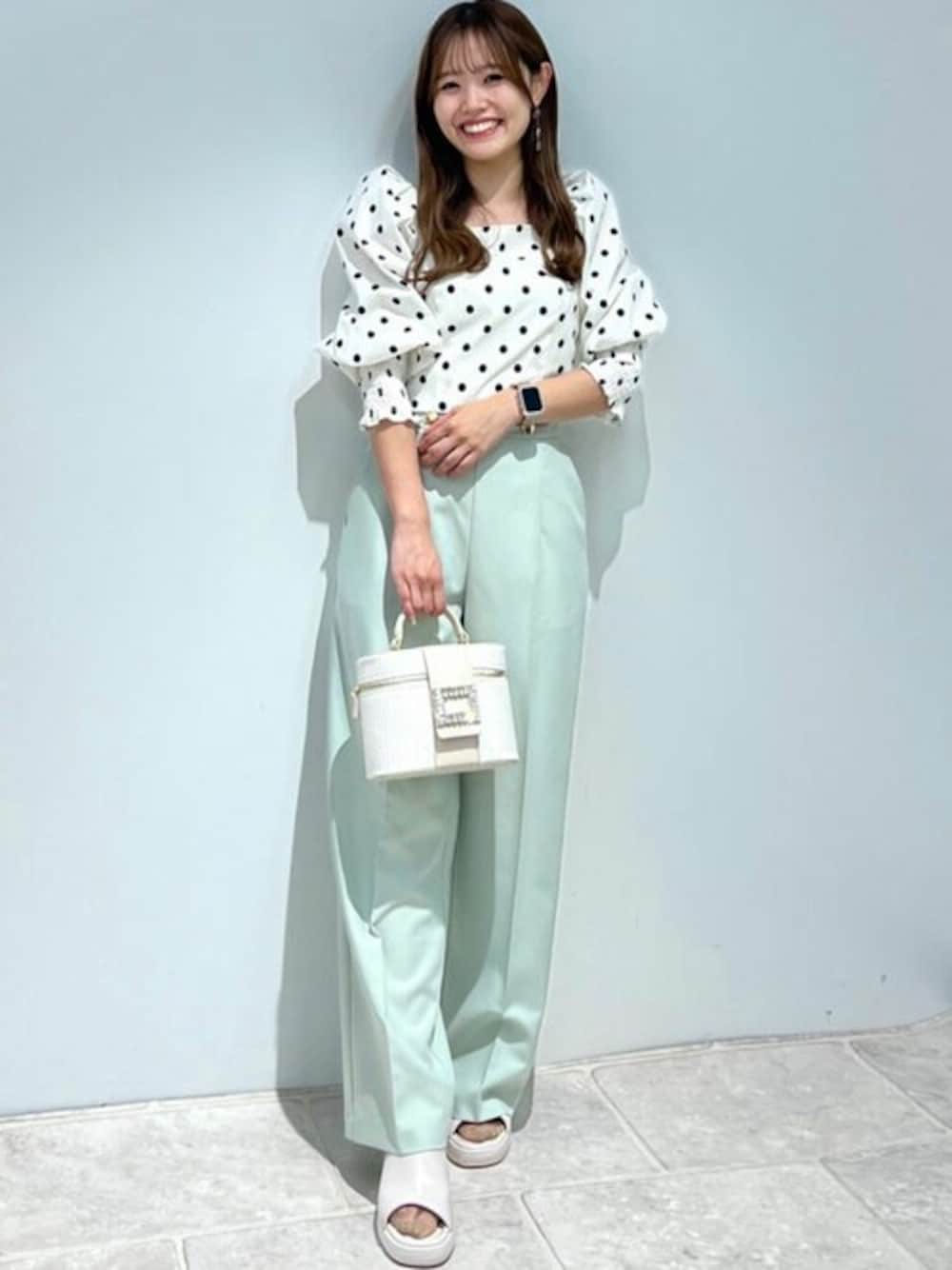 ドットのシャーリングブラウスとミントグリーンの ワイドパンツを合わせた春らしさ全開コーデ^^ パンツは後ろがゴムになっています!