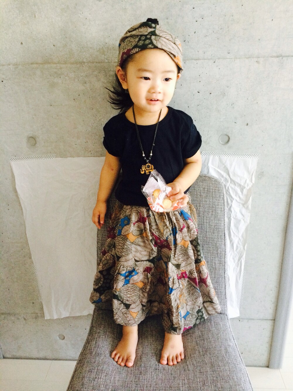 暑いと、アジアンしたくなる。 ゆるゆるで、楽そーですし、リゾート感出ますから^_^^_^ 以前のゆるパンの、スカートバージョン! 子供のマキシってなかなかないから、新鮮! 大人のよーなシルエットになった。笑 謎のフルーツ?植物かな?柄。